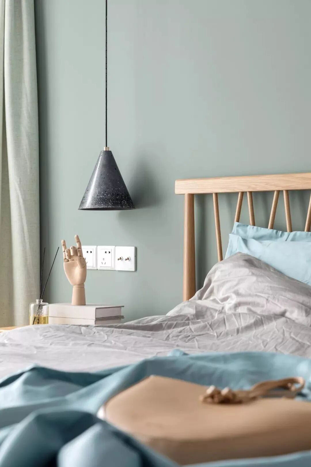 床头墙的吊灯,还有床头柜上精致的布置,让睡觉空间更加舒心安静。