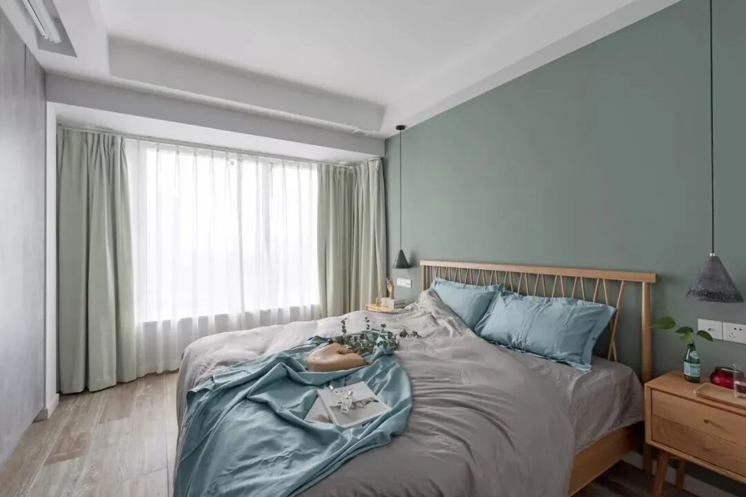 卧室床头背景墙素绿色的墙面,结合木质的床,现代舒适的床单,提供了个轻松惬意的睡眠空间。