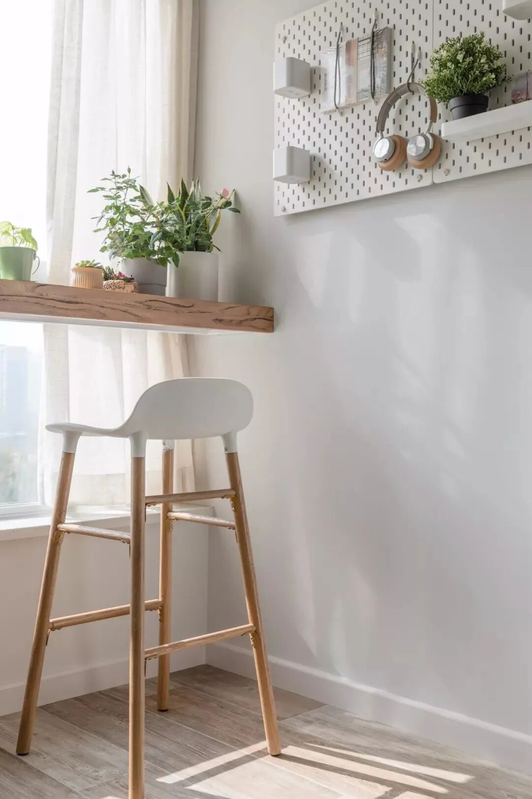 餐厅旁的窗户装了一块搁板吧台,木质的板材与吧椅,摆上小绿植,使得空间充满了文艺自然的氛围感。