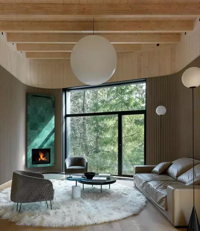 ▲房梁、墙顶的木元素,和铺装在地面的木地板上下呼应,不加修饰的原木色,如同窗外森林般,静谧而美好。