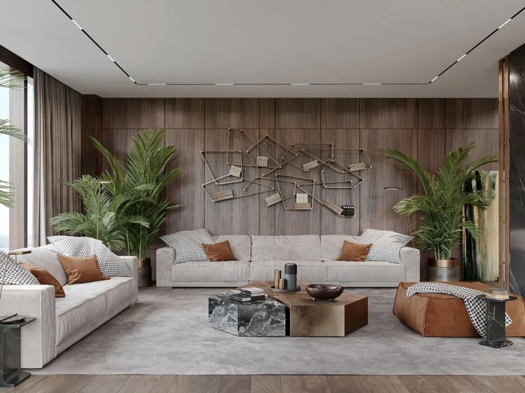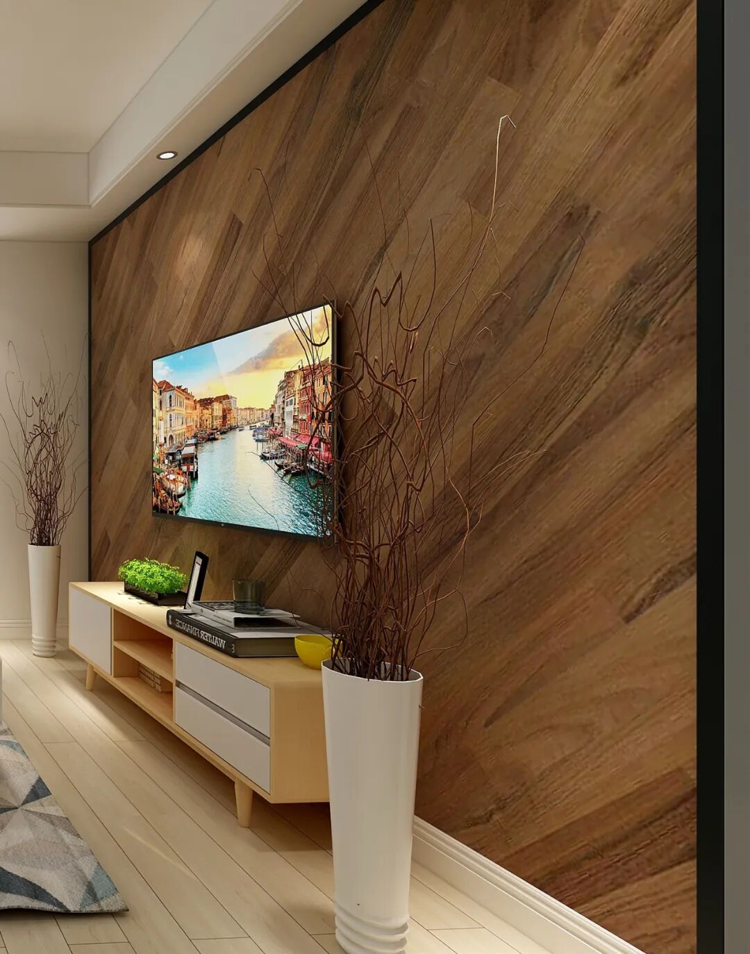 ▲仿古色调木地板+同色系木质沙发背景墙,演绎最具格调的轻奢风。