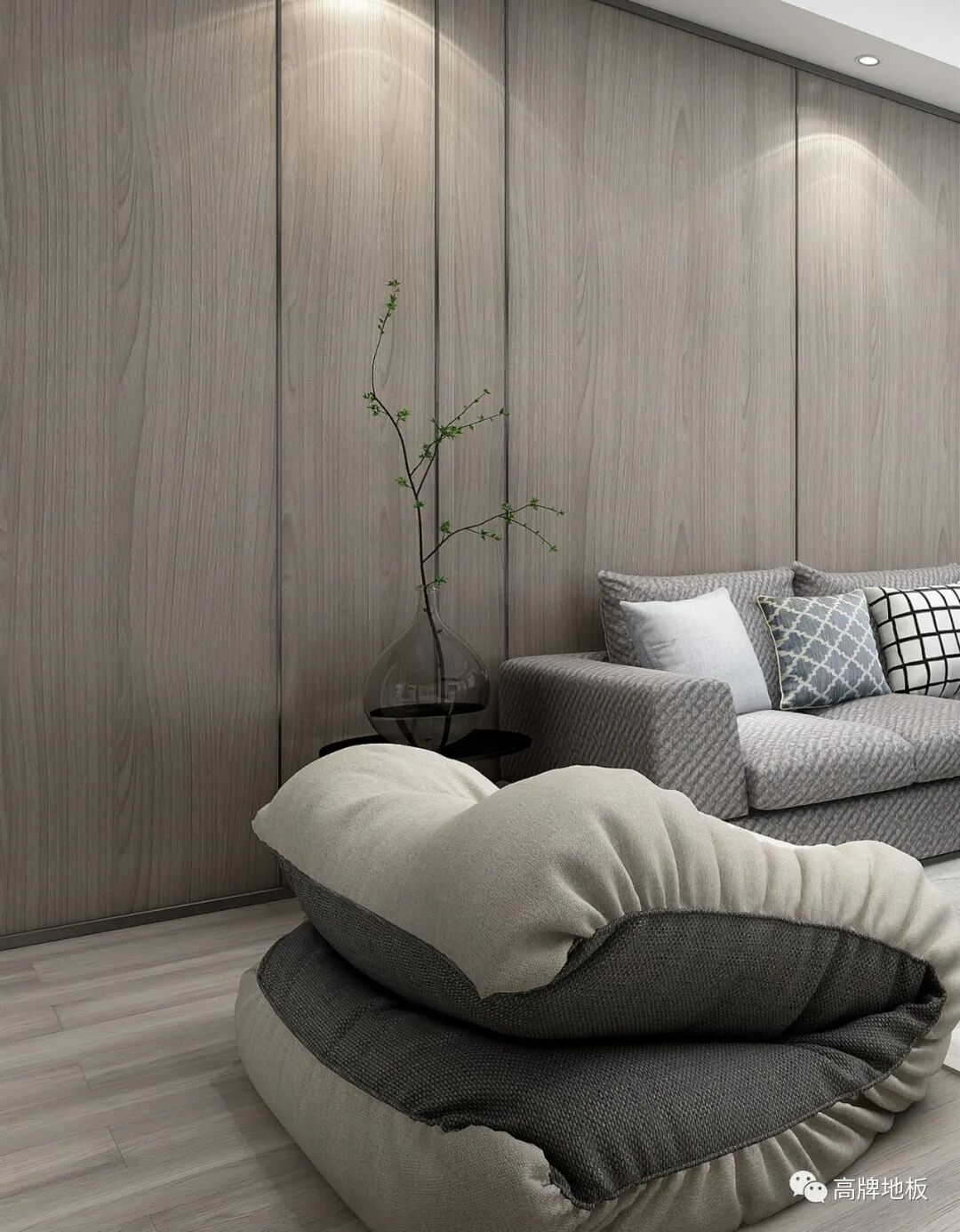 ▲木纹肌理细腻的高级灰木地板,与墙面融为一体,抒写浪漫极简之风。
