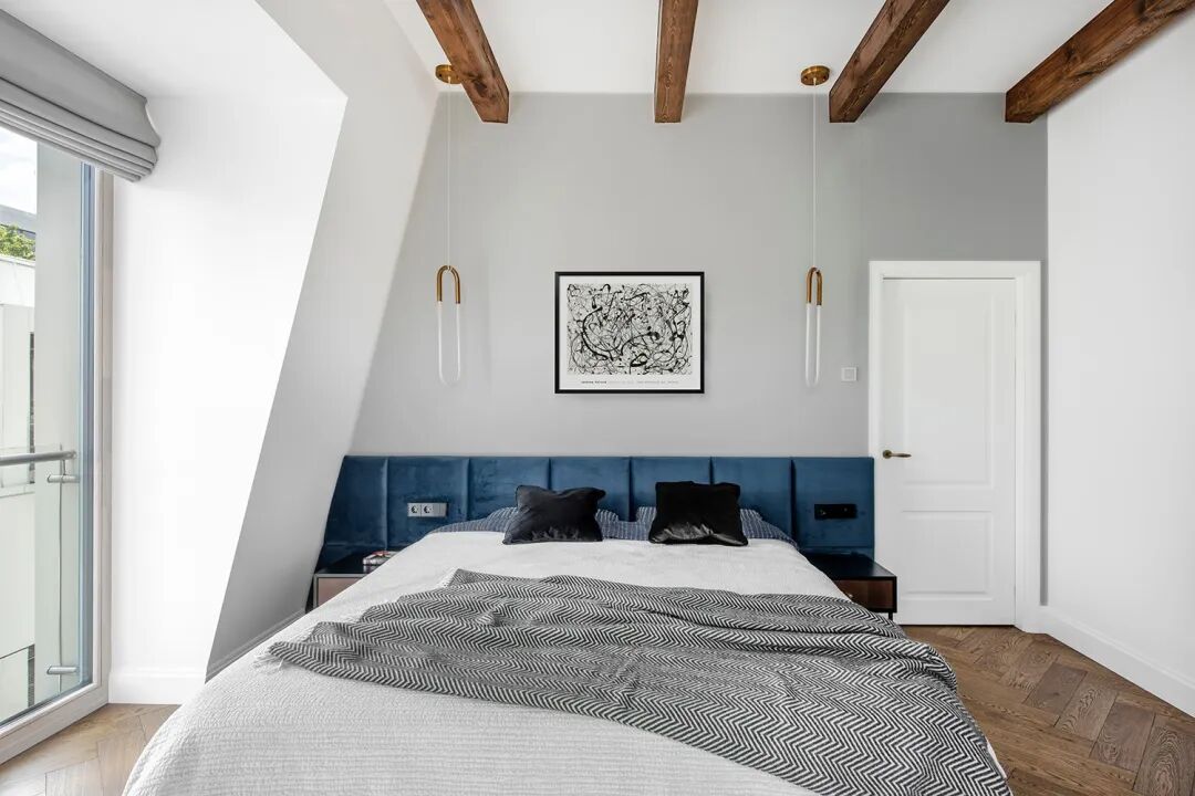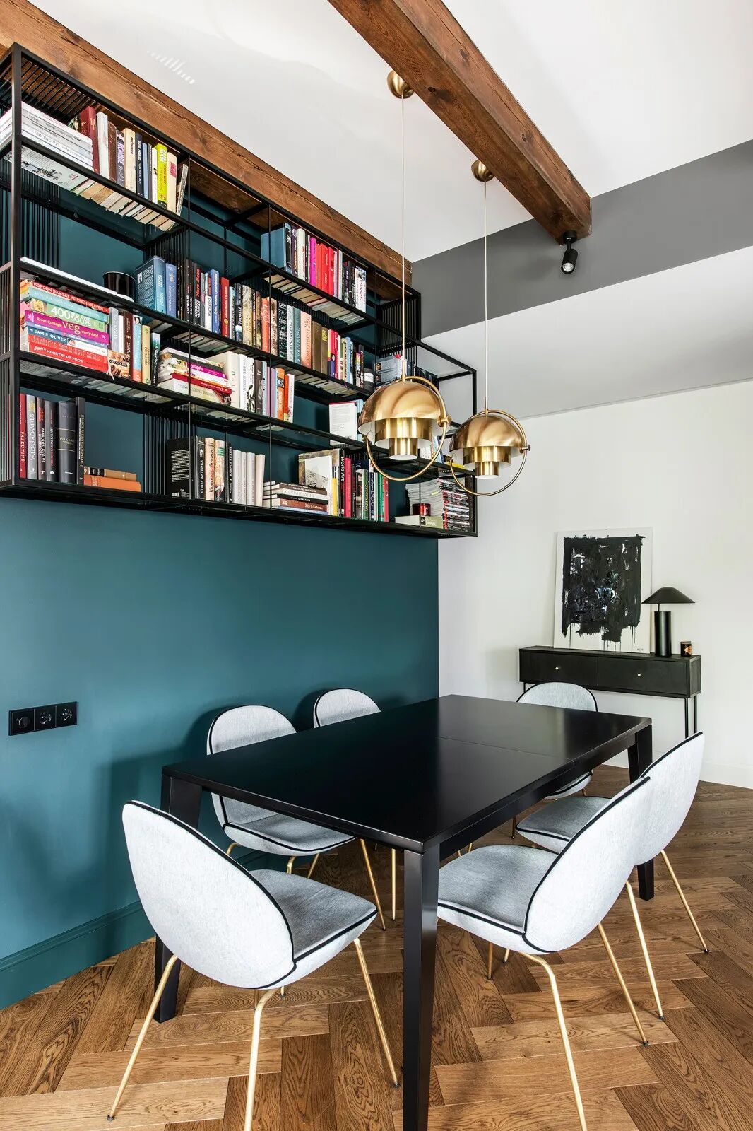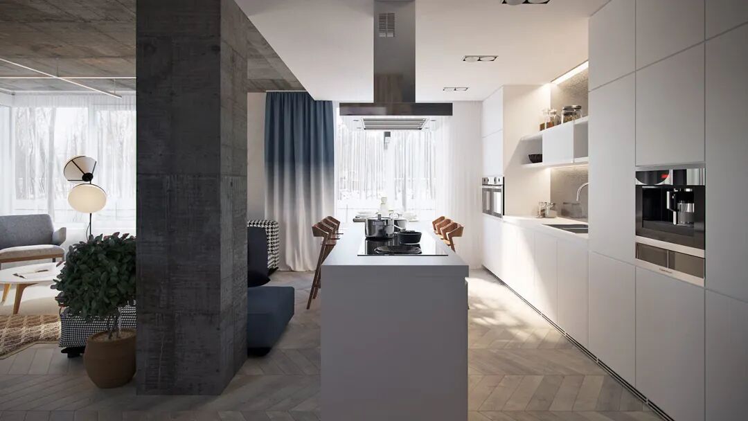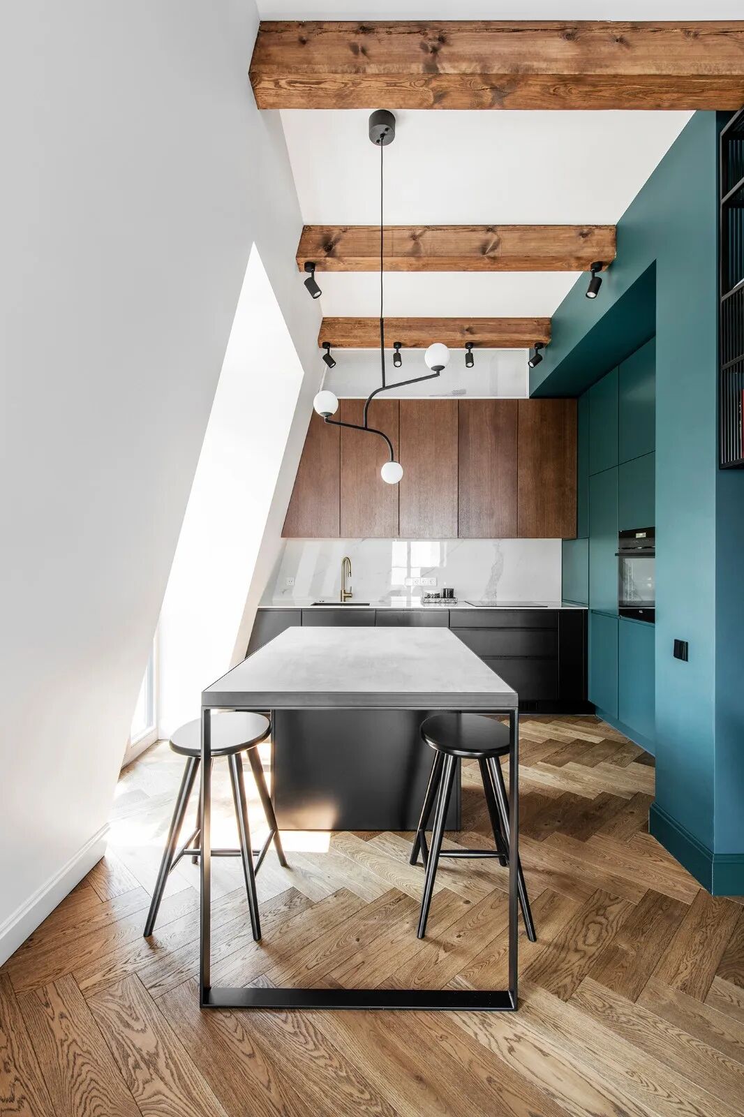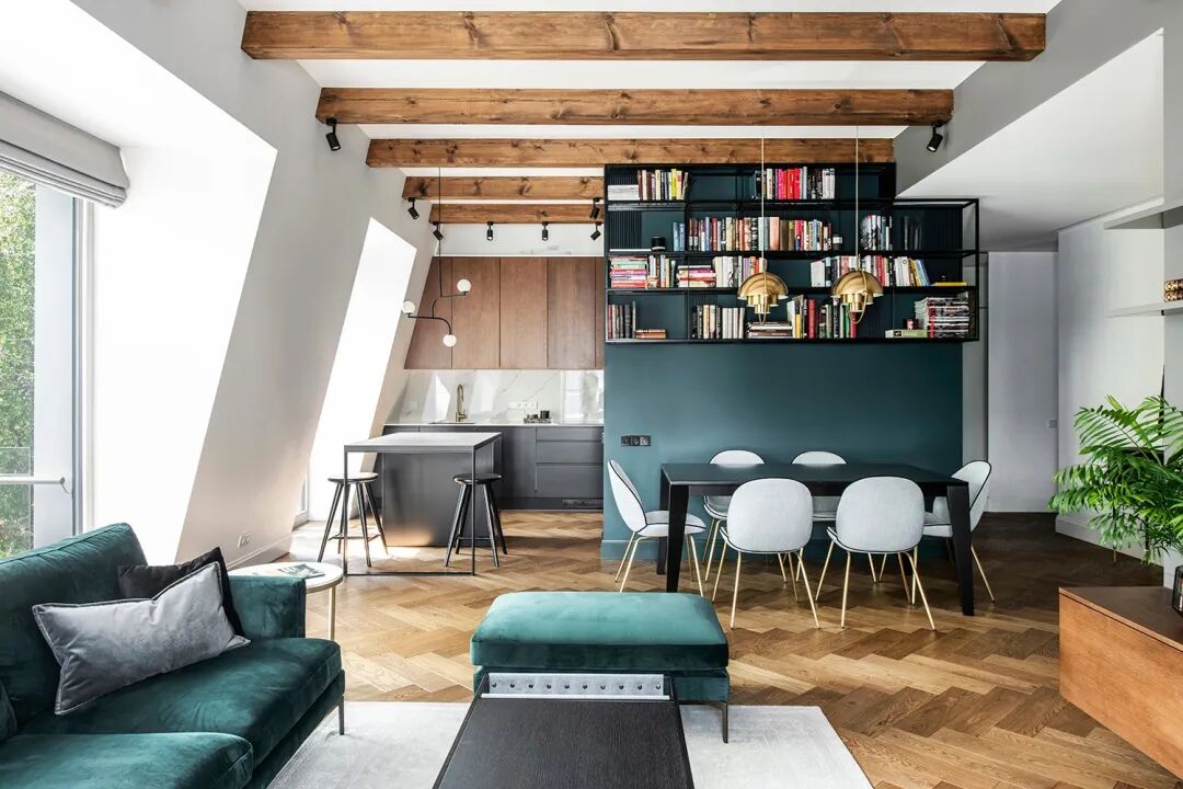 触手可及的木色,大面积留白的墙面,辅以矜贵而饱满的孔雀蓝,没有过多刻意的修饰,仅仅是清晰大气的木纹肌理穿插于各个区域,自然而然地打破空间的平淡乏味,让每一寸土地都流淌着居住者优雅的生活状态。