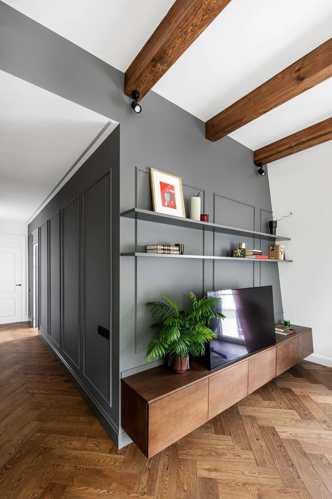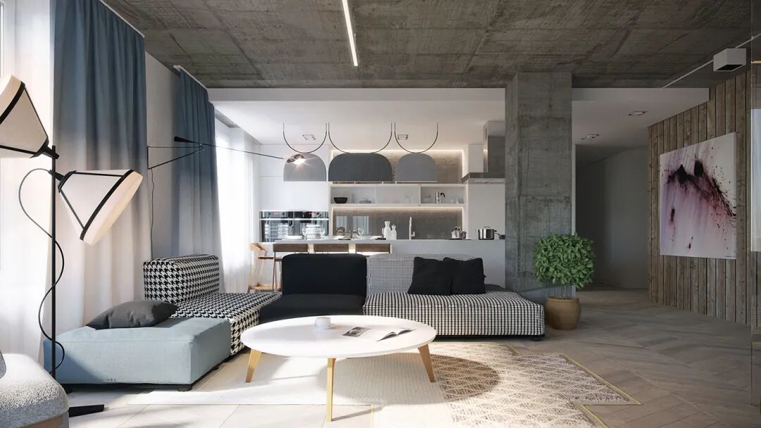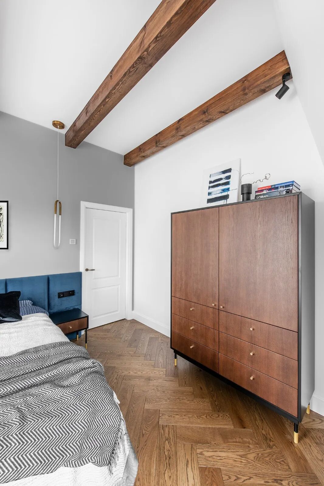原木色人字拼地板与颇具现代文艺气息的家装风格相结合,看似简约,却带给了空间无与伦比的自由、完整性,以及舒适感。