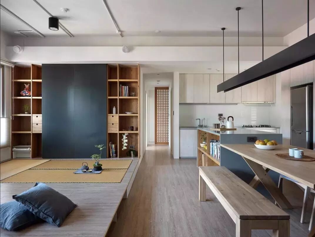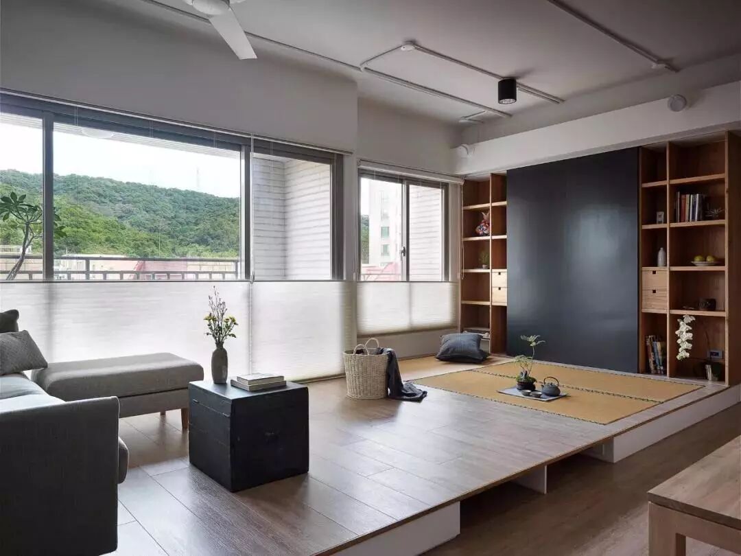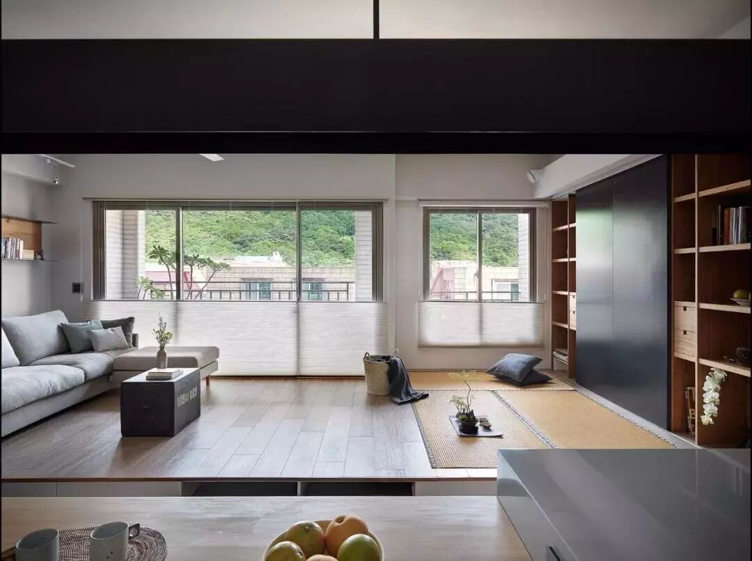 ▲台湾的一间公寓,客厅的地板比其他方架高了 20cm,下边有隐藏插座和储藏空间。客厅的地台区域内又铺了榻榻米,划分出另外一块休闲地,可以在这里小憩或者和朋友一起品茶聊天,也能让人感觉在家的每一刻时光都无比轻松,不受拘束的或坐、或卧、或躺,自由选择惬意的生活方式。
