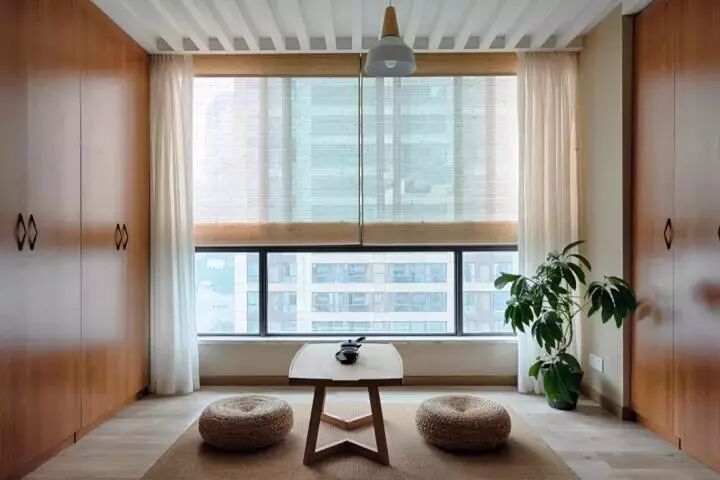 折叠坐垫/蒲团+矮桌,就是最简单的配套软装,人多的时候,将家具撤离,留出开阔干净的界面。