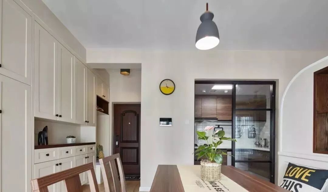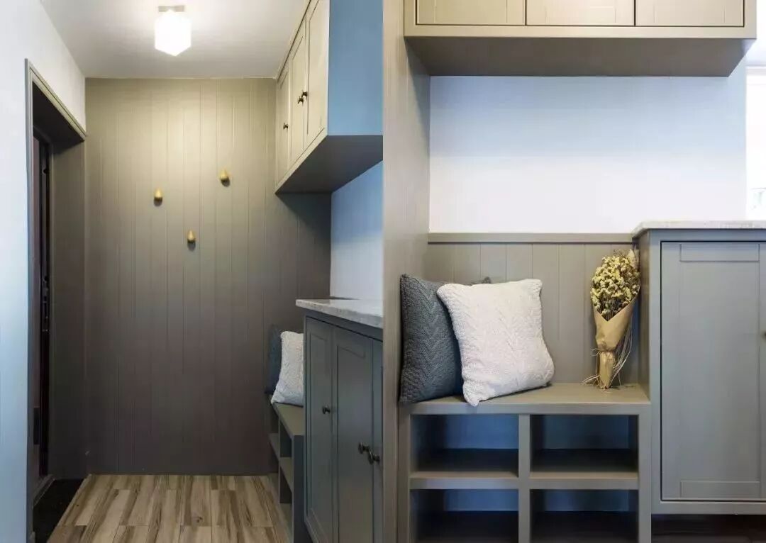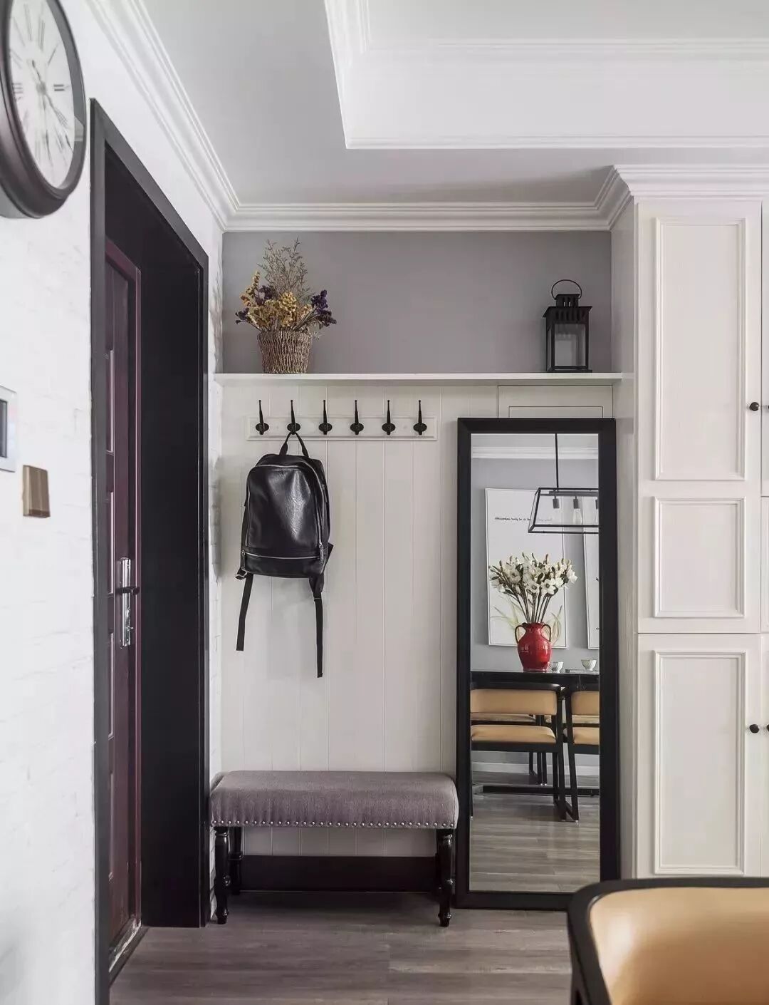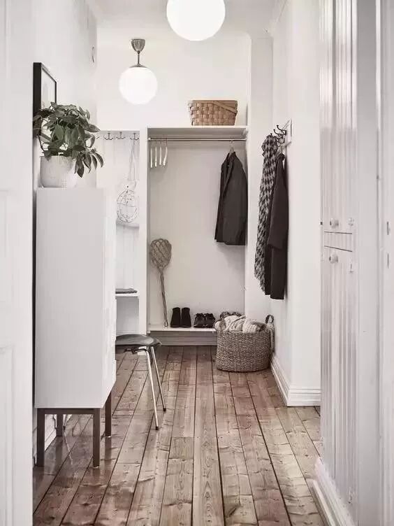 在玄关处打造衣帽间,铺上高端大气的木地板,可以让装出来的玄关漂亮又大气,再配上一盏合适的灯那效果就更美了。