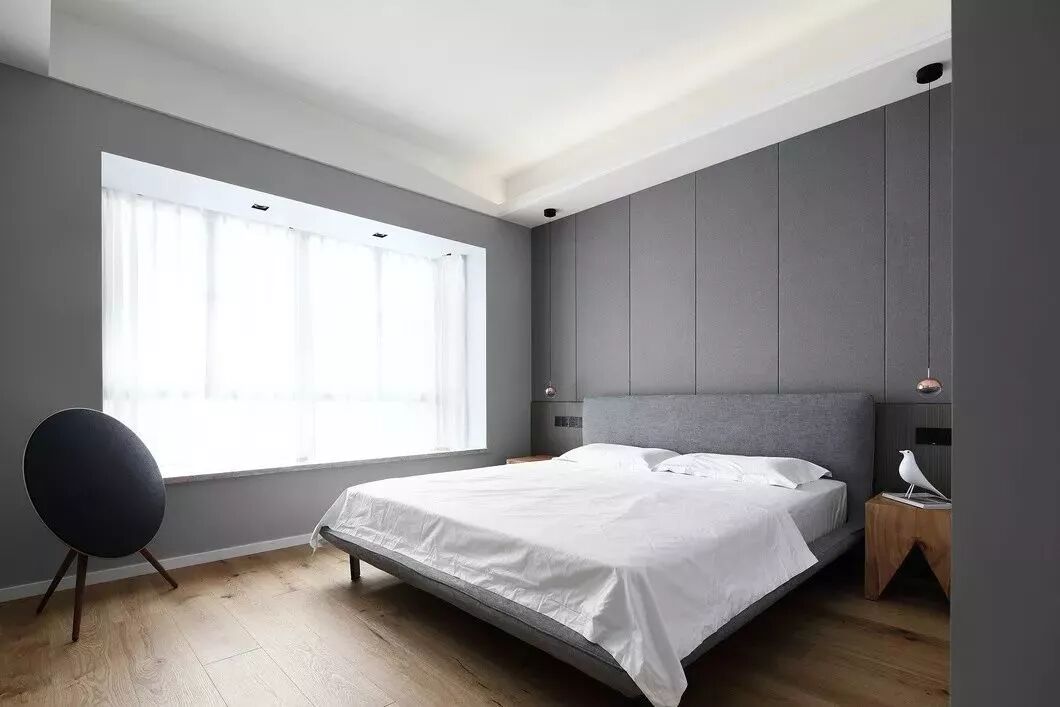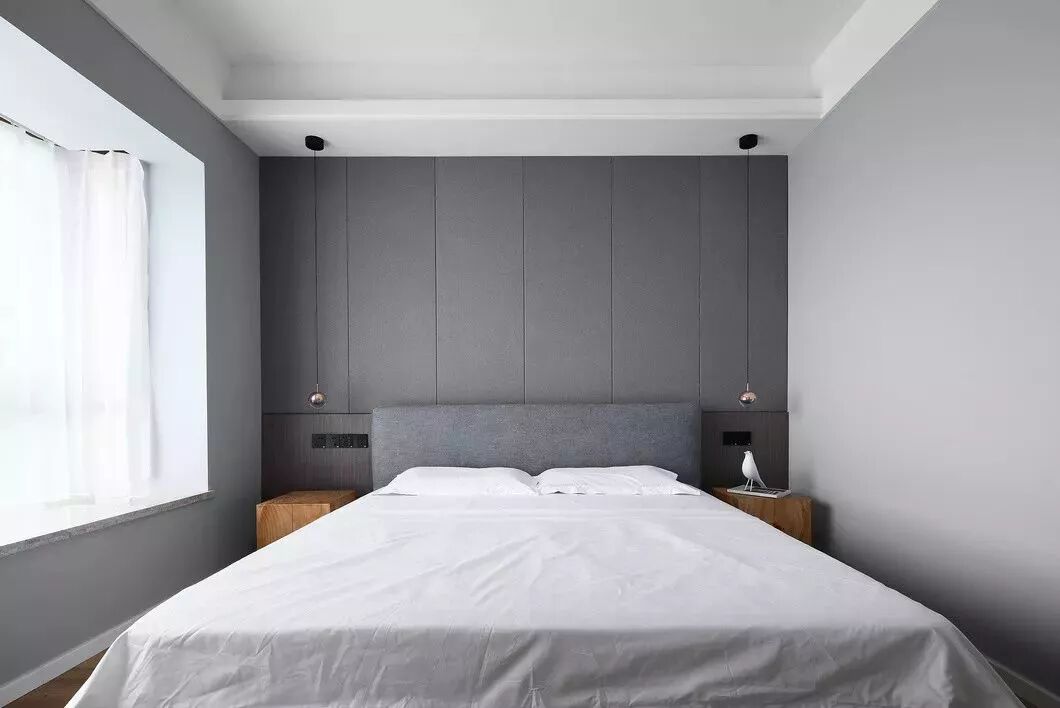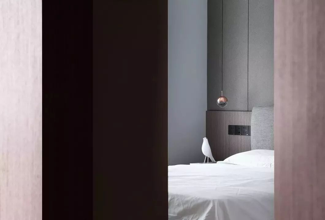 深灰色软包背景墙使空间柔软了许多,实木床头柜配上精致的金色小吊灯打破了空间的沉闷。整个空间简洁大气,单纯不繁琐,营造出宁静、优雅的睡眠空间。