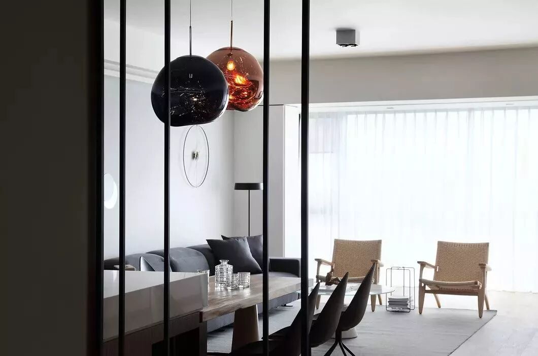入户正对客餐厅,用黑色铁制廊栅做玄关,在半遮半掩的同时增加装饰效果,黑色铁制廊栅做成了推拉门的形式,看上去是推拉门,实际是固定的屏风。没有复杂的装饰和色彩,简洁清新而又时尚感十足。