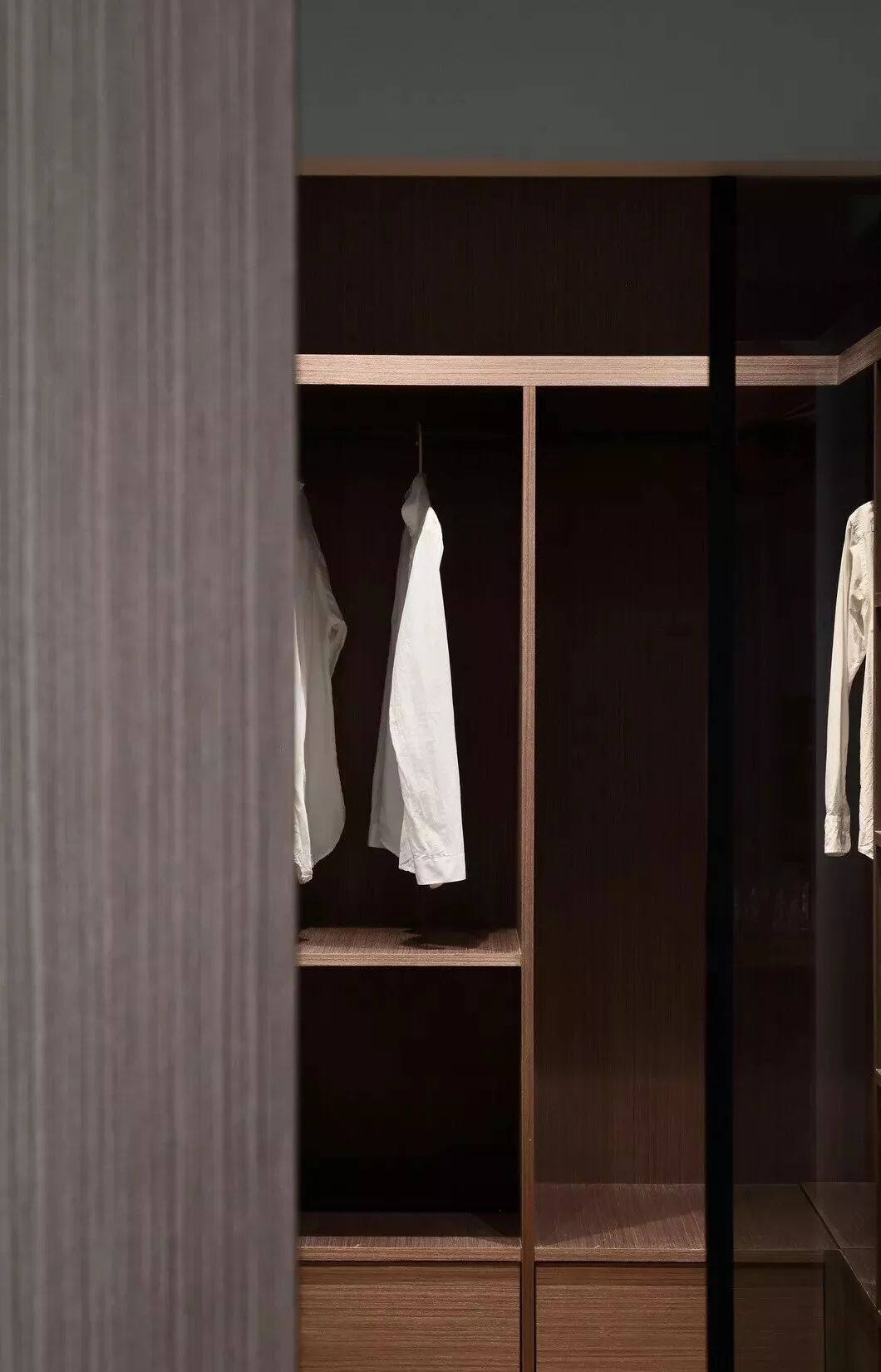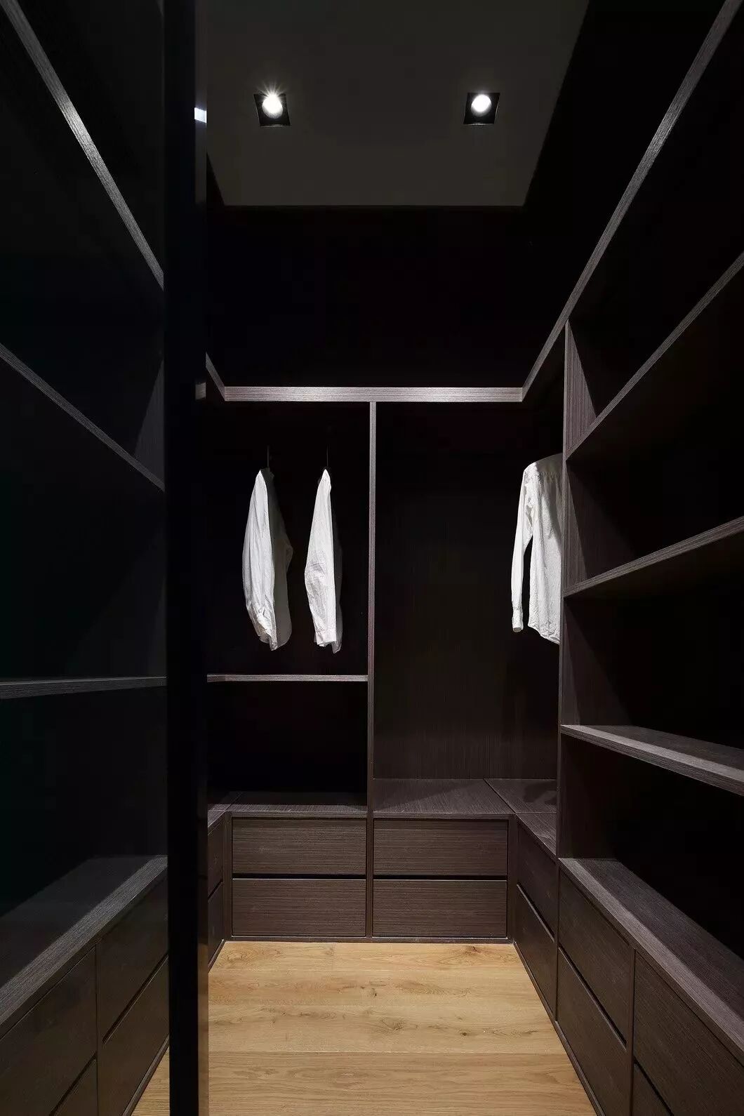 步入式衣帽间是木工师傅现场定制的,左右两侧为叠衣区,下方为多个抽屉可收纳袜子领结等小件衣物,分类明确,满足屋主对收纳的要求。