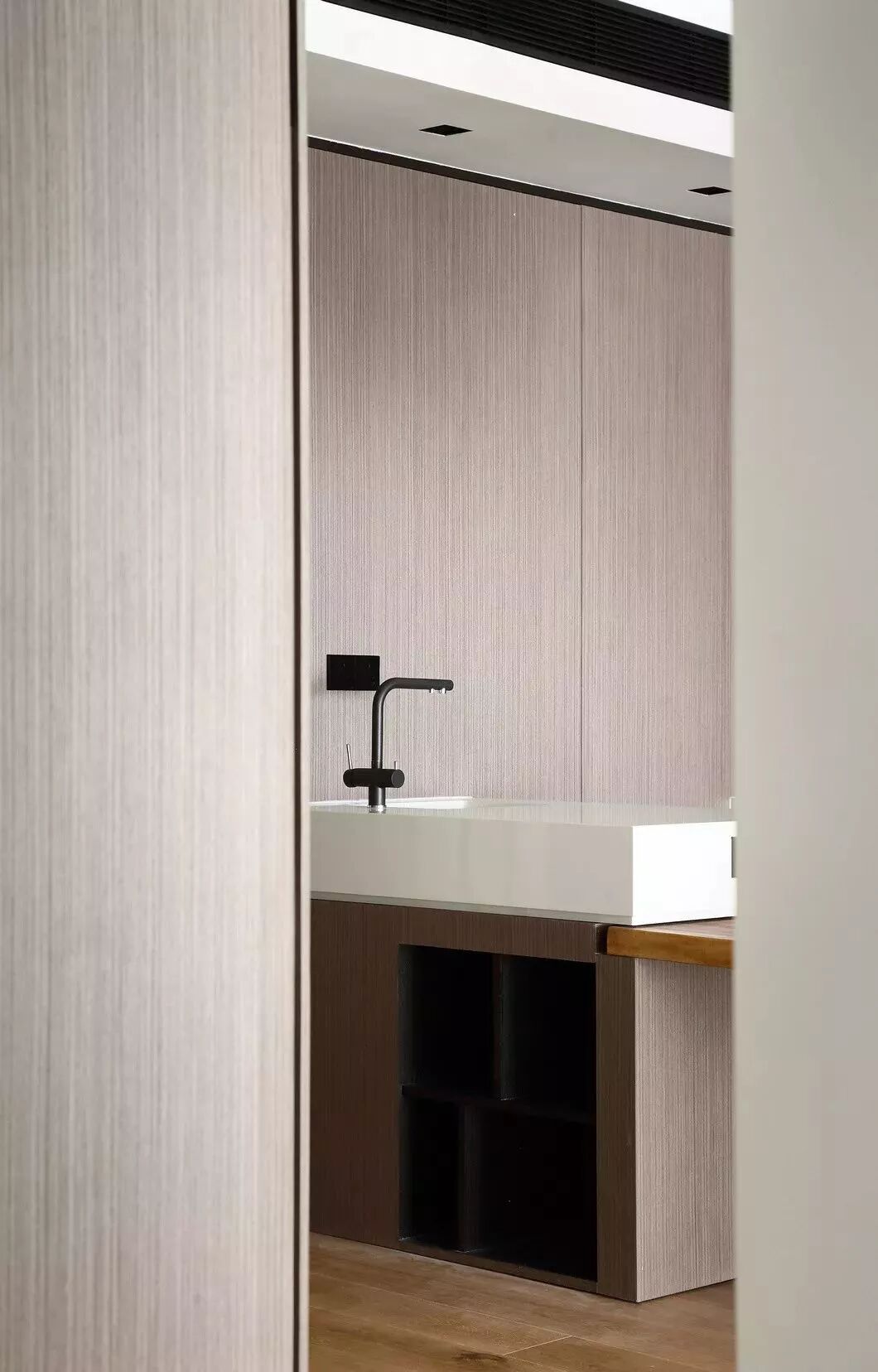 电视柜与墙体、主人房设计上处理成一个整体的面,主人房的房门被设计成了隐形门形式,运用了有质感的木饰面营造出不经意的“门”,进入这扇门的背后会发现别有洞天。