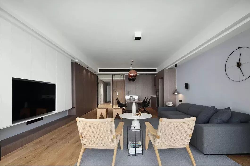 客厅的落地窗承接了阳光的洗礼,以“白灰木”的全屋搭色,让客厅空间看起来宽敞明亮之余,更添宁静雅致的休憩氛围,结束一天的繁忙工作后回到家里,情绪也随之被安抚舒展。
