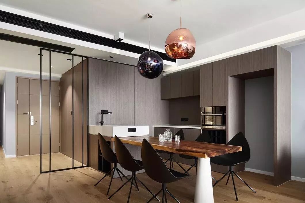 餐厅延续了客厅的整体效果,同时又展现出自己的新意,餐桌其实是水吧与一整块胡桃木衔接而成,这块区域不仅用于就餐,平时也可以在此用电脑办公,餐桌岛台一体。