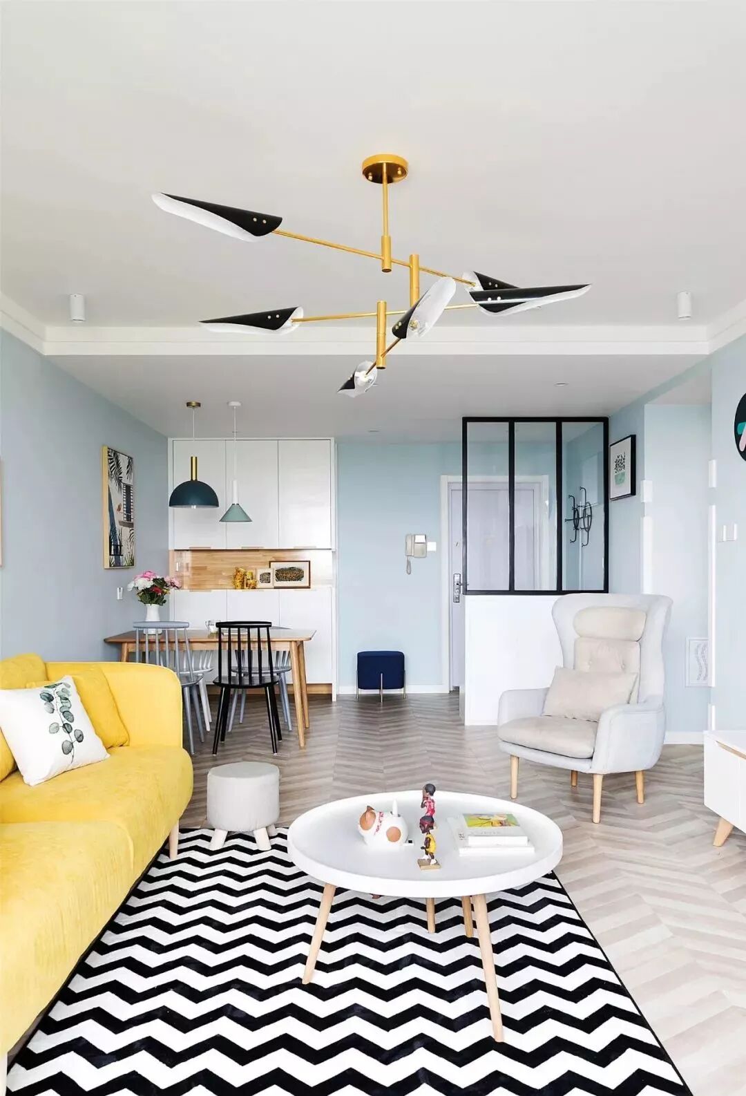 ▲ 客厅整体以淡蓝色的基调,搭配黄色布艺沙发,在清爽的基调下装扮出一个活泼跳跃的空间。