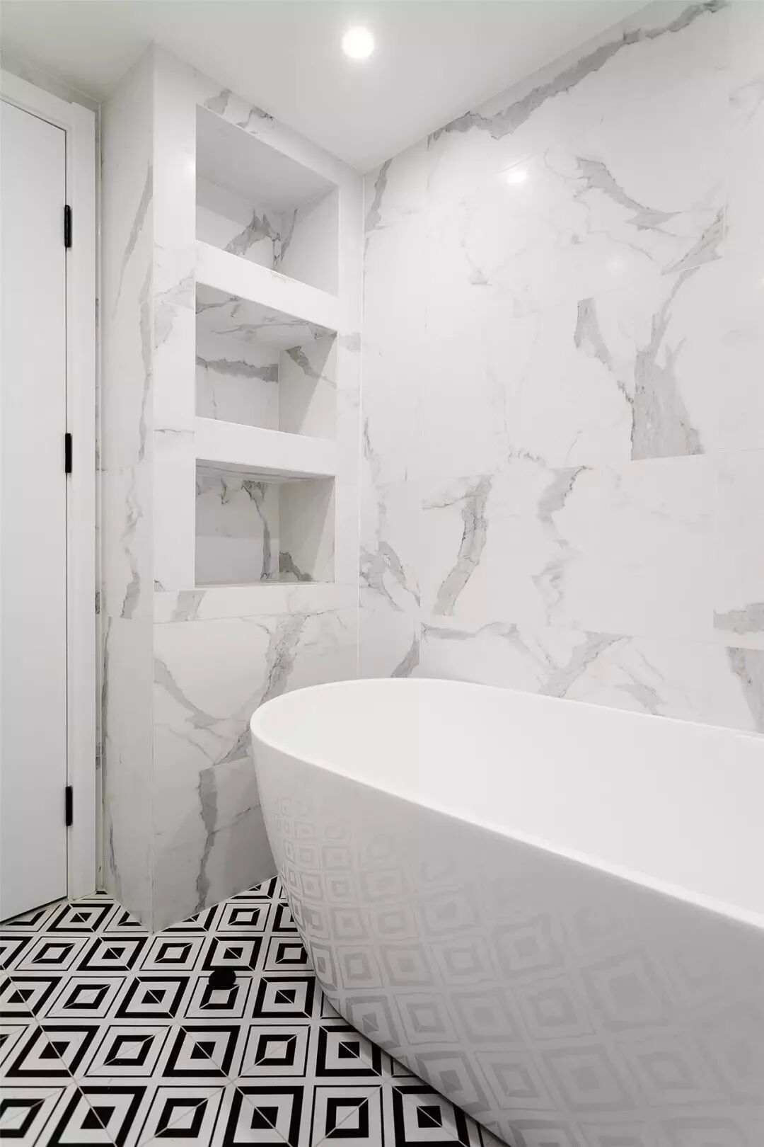 ▲ 浴缸一侧的墙面设计了壁龛,保持空间整洁的同时,又实现了实用的功能。