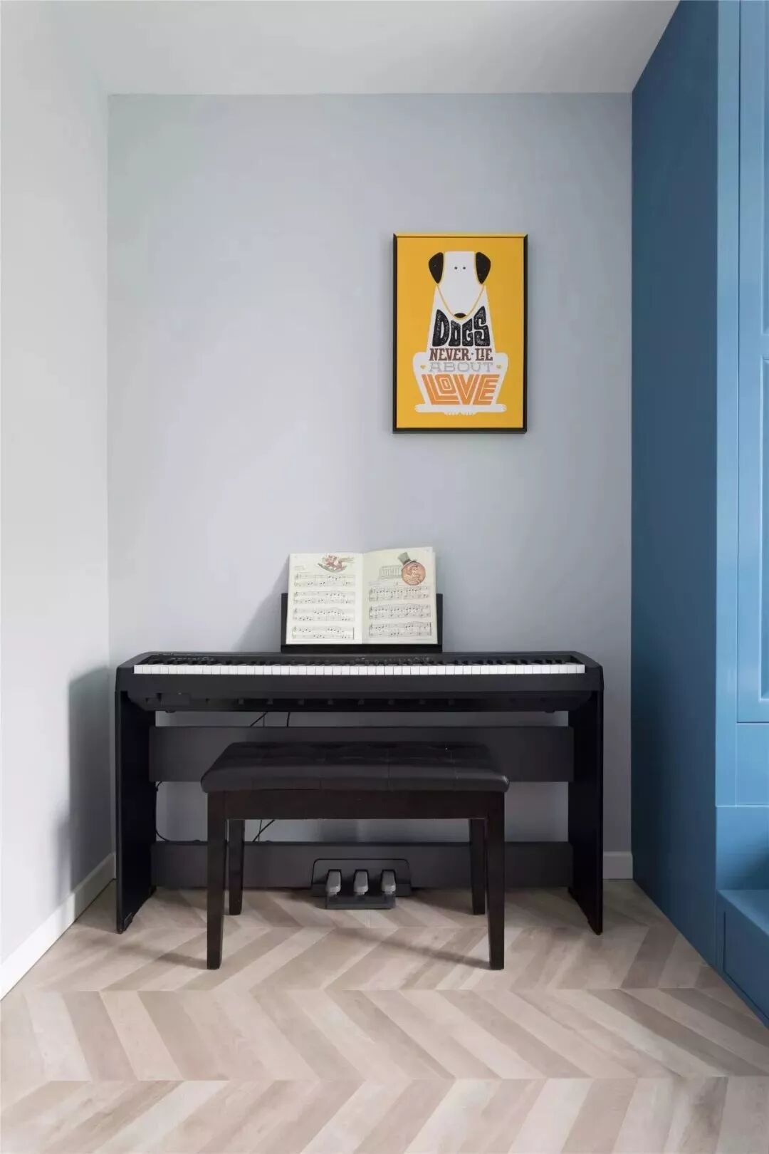 ▲ 儿童房定制了宝蓝色的衣柜与榻榻米,并在榻榻米边上嵌入了一个书桌,使空间更加宽敞,满足玩耍的活动空间及电子钢琴的放置。