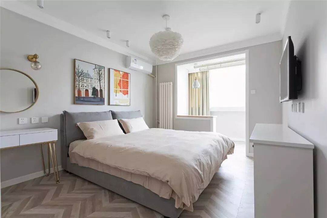 ▲ 主卧以暖灰色为基调,床头一边是床头柜,一边是梳妆台,整体宽敞舒适。