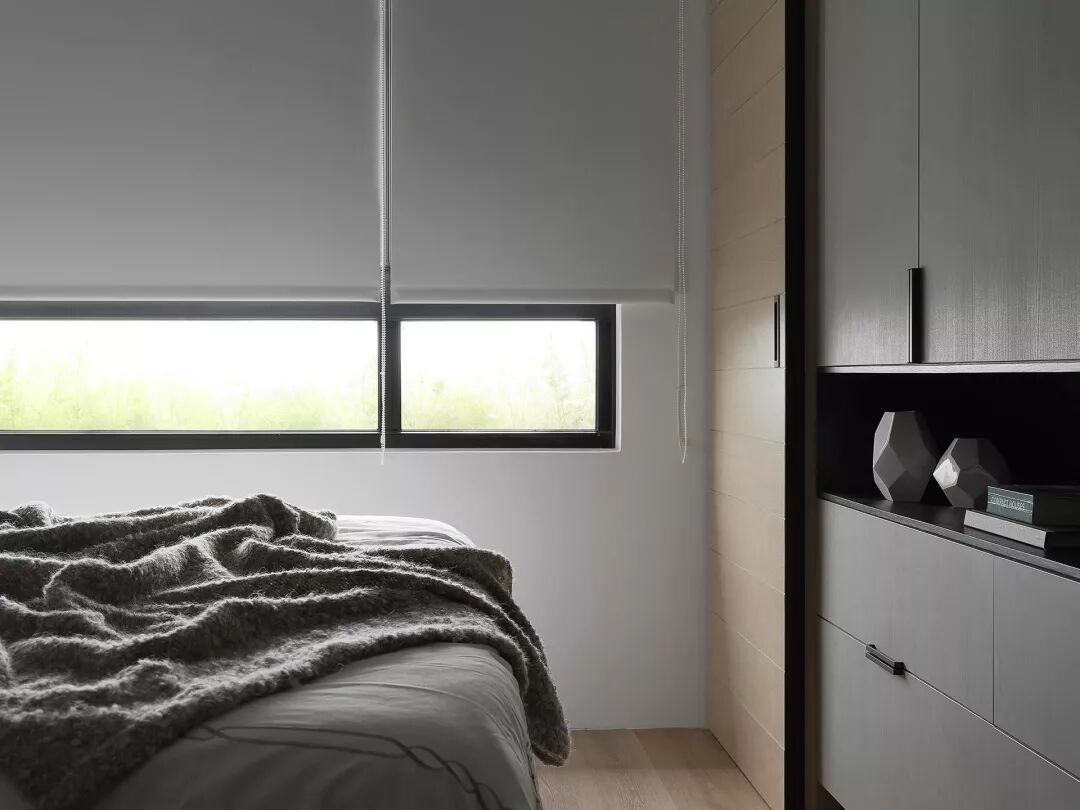 床尾的衣柜中间做了留空处理,摆上一些小摆件,别有一番的格调。