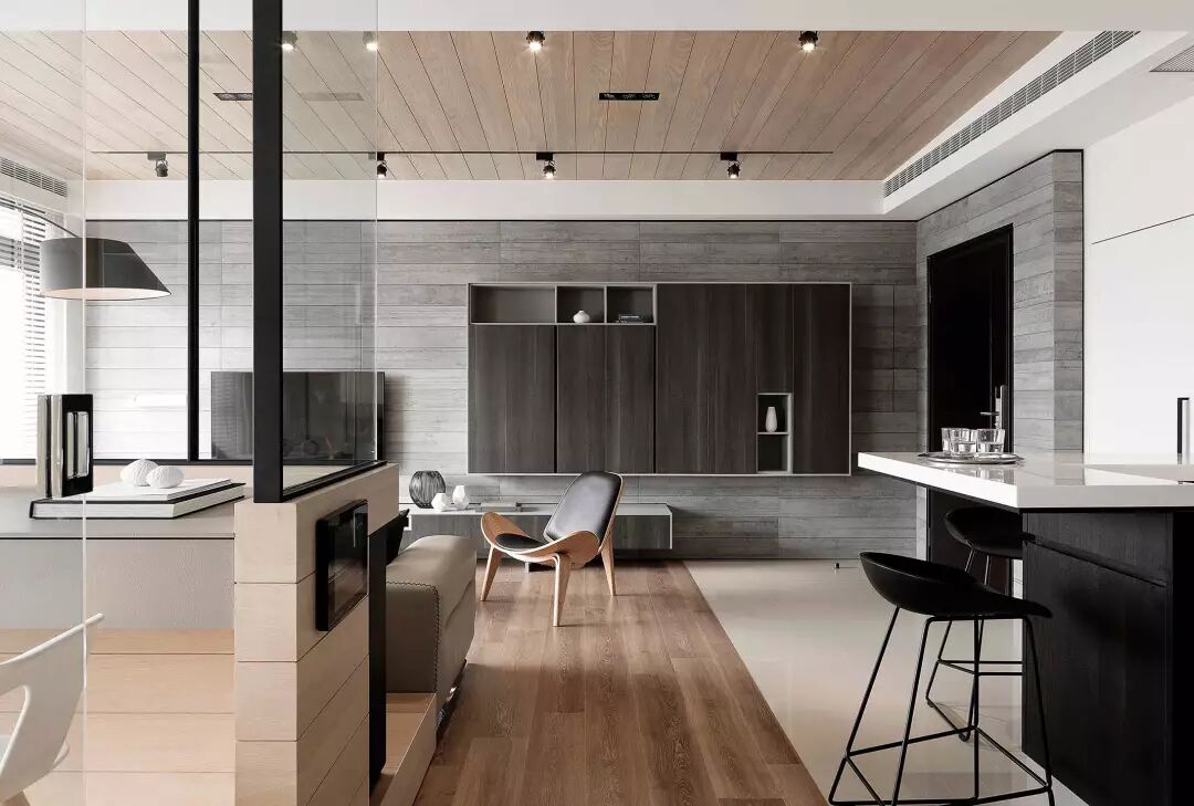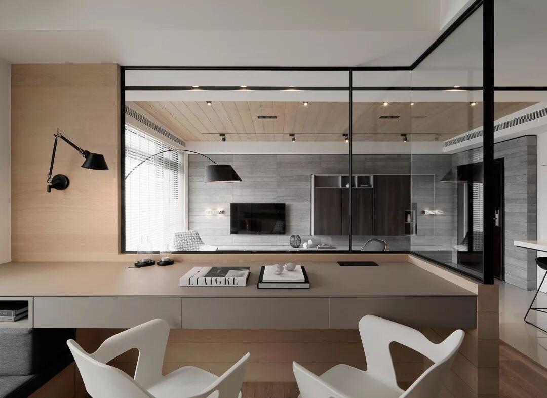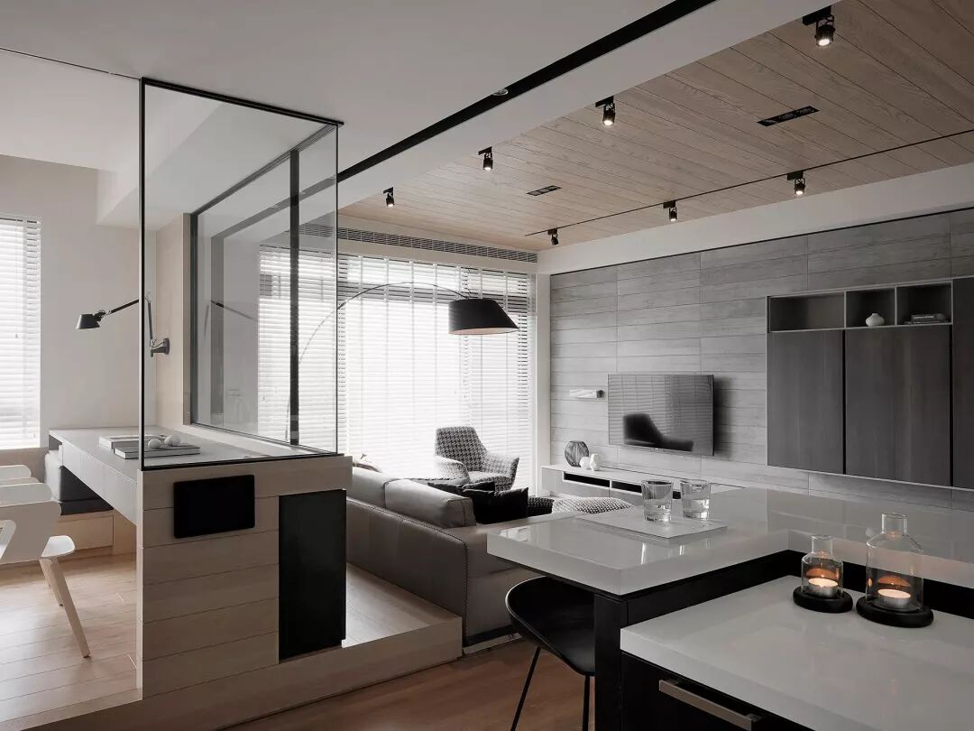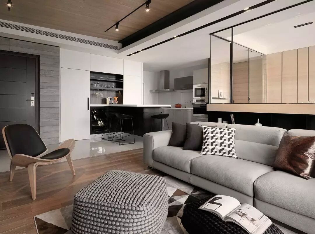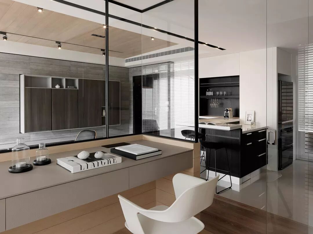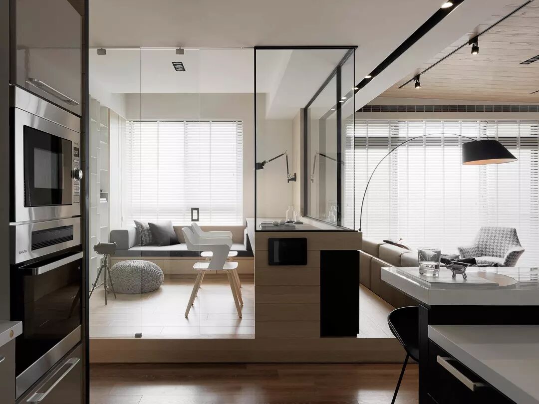 厨房和客厅采用半墙和透明的黑框玻璃做分隔开来。