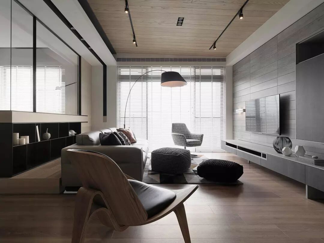木色的天花板很清新自然,因为是原木色属于暖色系,所以营造了一种很温馨的感觉,让以灰色为主色调的客厅变得不那么低沉。