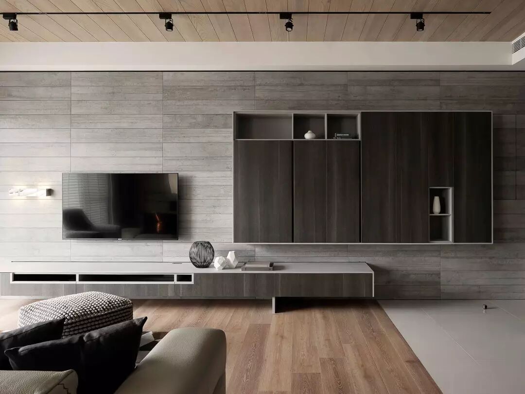 悬空的灰色电视柜非常方便,旁边的墙面上设计了一个跨度很宽的柜子。