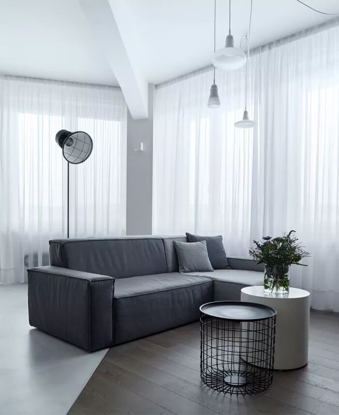 一个极简主义的100平米小三房,没有多余的装饰,没有复杂艳丽的颜色,以灰色为主色调,营造了一种高级感,家具不多不少,造型简单。