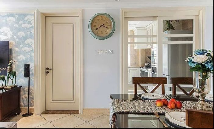 当墙面是冷色调时,相对应该选择浅一点的木门,如混油白色等。