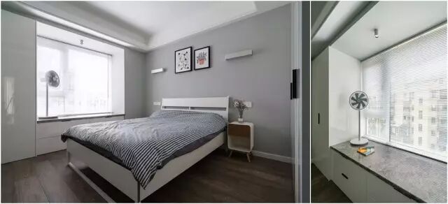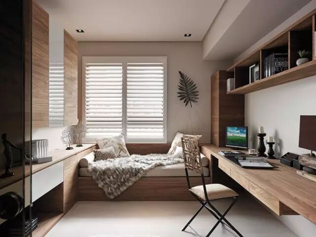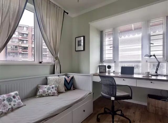 靠窗做嵌入悬空书桌,在书桌前面的窗户做百叶窗,可以避免使用窗帘的空间浪费。