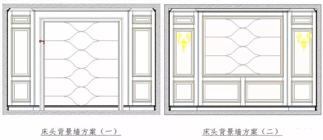 注:①.床头背景墙方案一、方案二均为左右整体型墙板,中部外凸型结构。方案一床头背景软包到底,方案二床头背景软包与墙板结合,上属两类方案未使用套框收口。