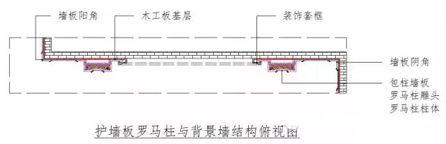 注:①.装饰罗马墙板柱一般为装饰性柱体,设计师应了解雕刻柱头最大厚度方可计算上方围口厚度或装饰线的内沿尺寸,并以柱内空尺寸打好固定基层,方便安装。