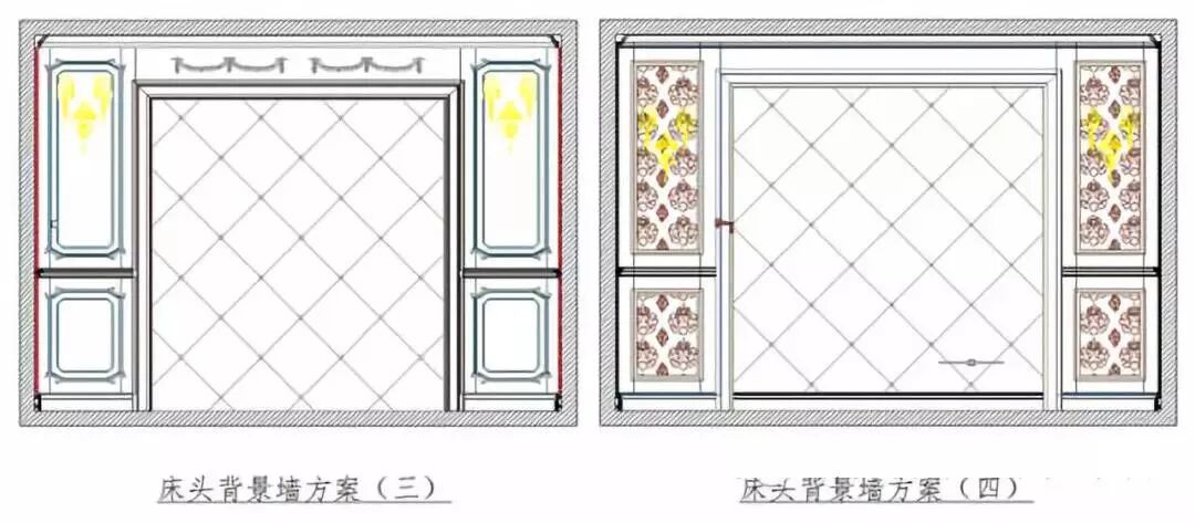 注:①.床头背景墙方案三左右二合一组合墙板,配有腰线。方案四左右墙框型反扣线加墙板、基层厚度,套框线厚度应考虑腰线、脚线收口。