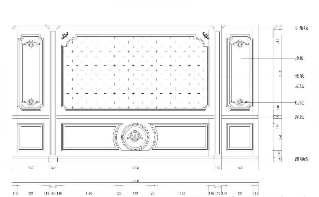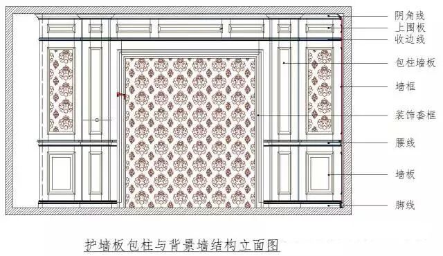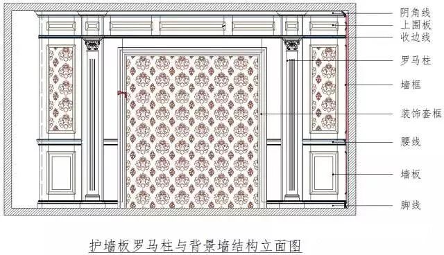 护墙板主要由墙板+装饰柱+顶角线+踢脚线+腰线几部分组成。如下图所示: