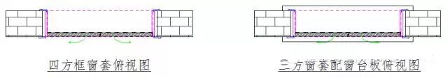 ③.四方框窗套、三方框加窗台板窗套有单、双在套线选择,一般常见为单面套线(房间窗套、阳台窗套等),窗台板厚度36—40mm,外飞角在套线外30至50毫米左右。