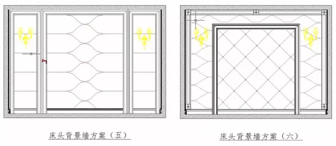 注:①.床头背景墙方案五左右中均使用套框线型包覆软包,方案六为外框包内框型背景墙,左右上、内中均使用软包或硬包处理。