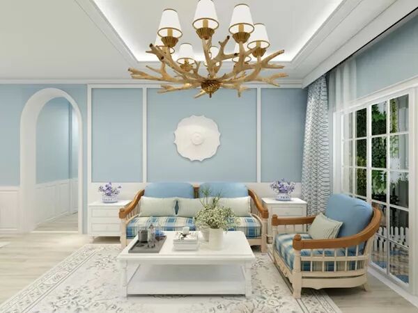 相同的颜色打造视觉上的统一,不同的花纹突出个性。比如湖蓝色墙纸跟蓝色沙发搭配,加上浅蓝花纹窗帘,循序渐进,富有动感,整个空间显得很清新。