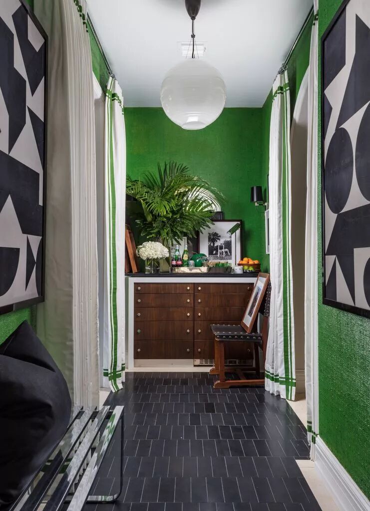 “我们基本上与无窗空间合作,”康涅狄格州的设计师Billy Ceglia说,他设计了这个楼上的大厅。为了帮助打破漫长的空间并增加深度,他的团队利用了经典的portières(挂在门廊上的窗帘)和草绿色亚麻布窗帘以及大型白色棉质斜纹布带,极大程度的丰富了视觉效果,使空间显得不再无聊。