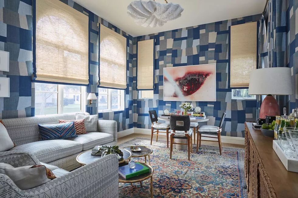 洛杉矶设计师彼得·邓纳姆(Peter Dunham)说:“每当我装饰墙壁时,我都喜欢混合使用的窗帘。” 他将客房设计成舒适的休息室。他将一双定制的褶皱面板挂在与墙面布料相同的印花面料上(拼贴,来自他自己的系列),其余的窗户用火柴编织色调和蓝色亚麻装饰。“色调的自然材料使空间不再显得乏味,而且窗帘的装饰有助于它与房间的其他部分相互协调。”