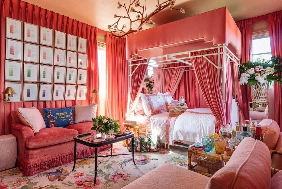 精美的窗帘可以为缺乏建筑细节和对称性的房间带来温暖。设计师Danielle Rollins使用褶皱帷幔和罗马色调为空间营造一种保护隐私的舒适感。设计师解释说:“用织物覆盖房间和床铺,营造出一种宁静的感觉。”