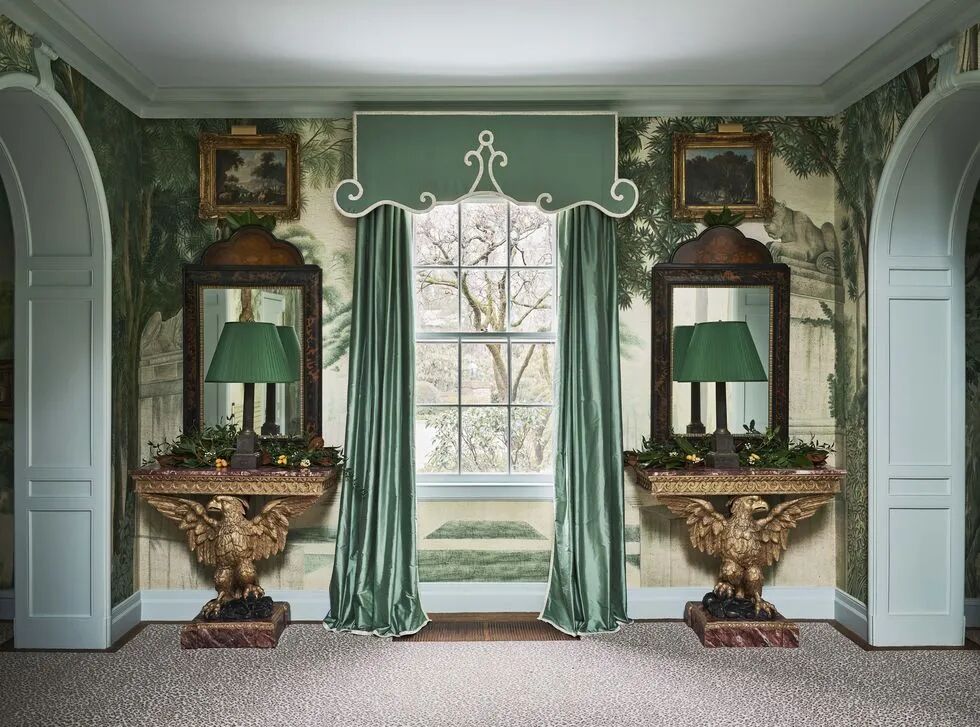 在这个康涅狄格住宅的走廊里,一块丝绸塔夫绸——“向 Dorothy Draper 致敬”——用精巧的奇思妙想框住了窗户。