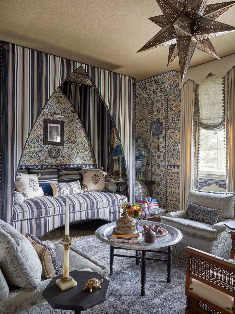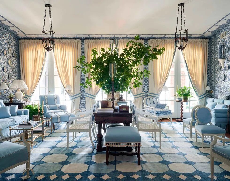 在这间客厅里,设计师 Mark D. Sikes 给三扇法式门装了框,这些门用象牙色的褶皱窗帘搭成,背面用蓝色带子装饰,灵感来自 Rory Cameron 在佛罗伦萨 客厅里的窗帘,由Shade Store制作。