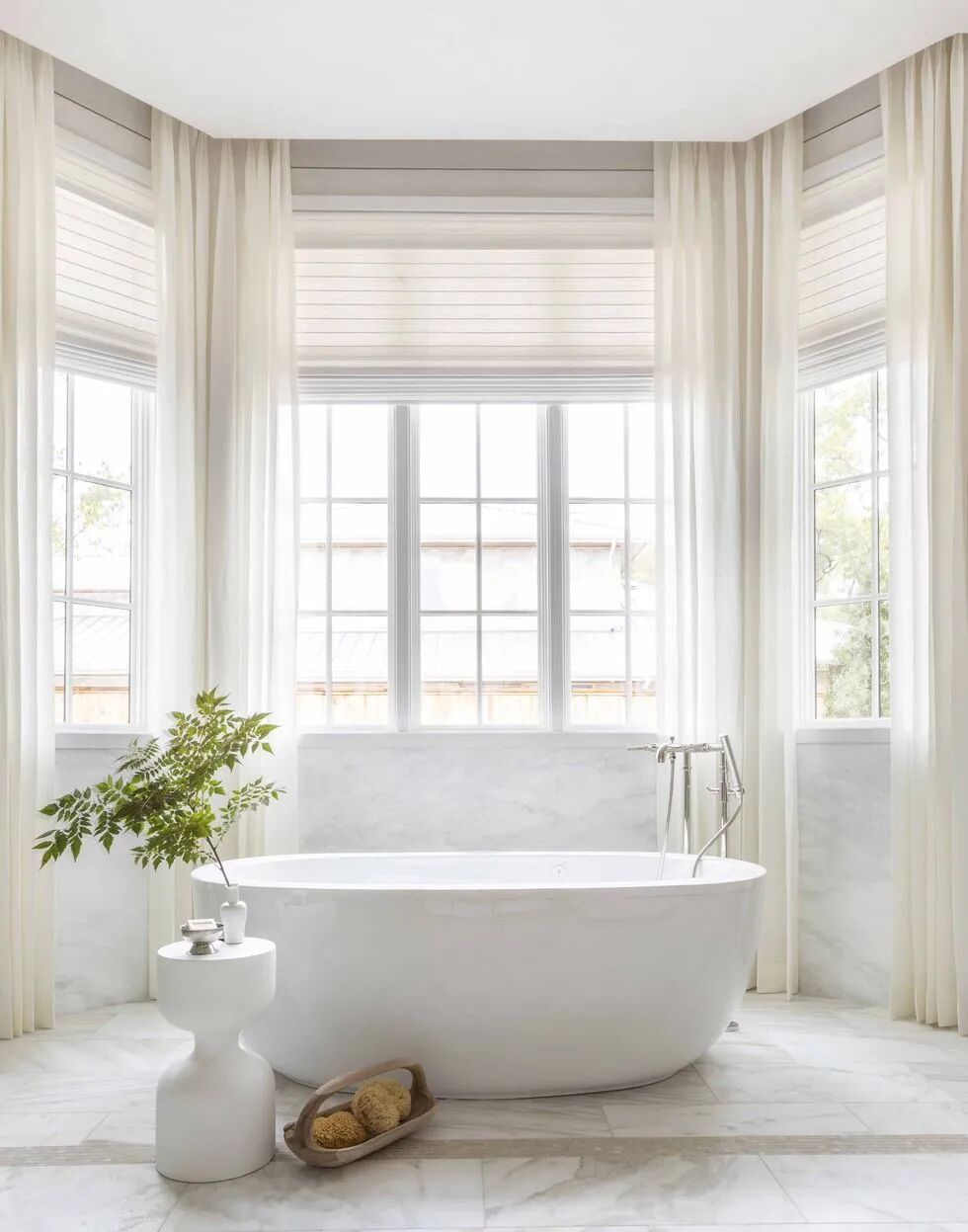 设计师 Marie Flanigan 表示:“对于这间舒适的主浴室,我选择了透明的窗帘,并将其插入天花板,以提高房间的整体空灵质量。” “我喜欢半透明的织物让它发光的同时仍提供隐私的方式。”