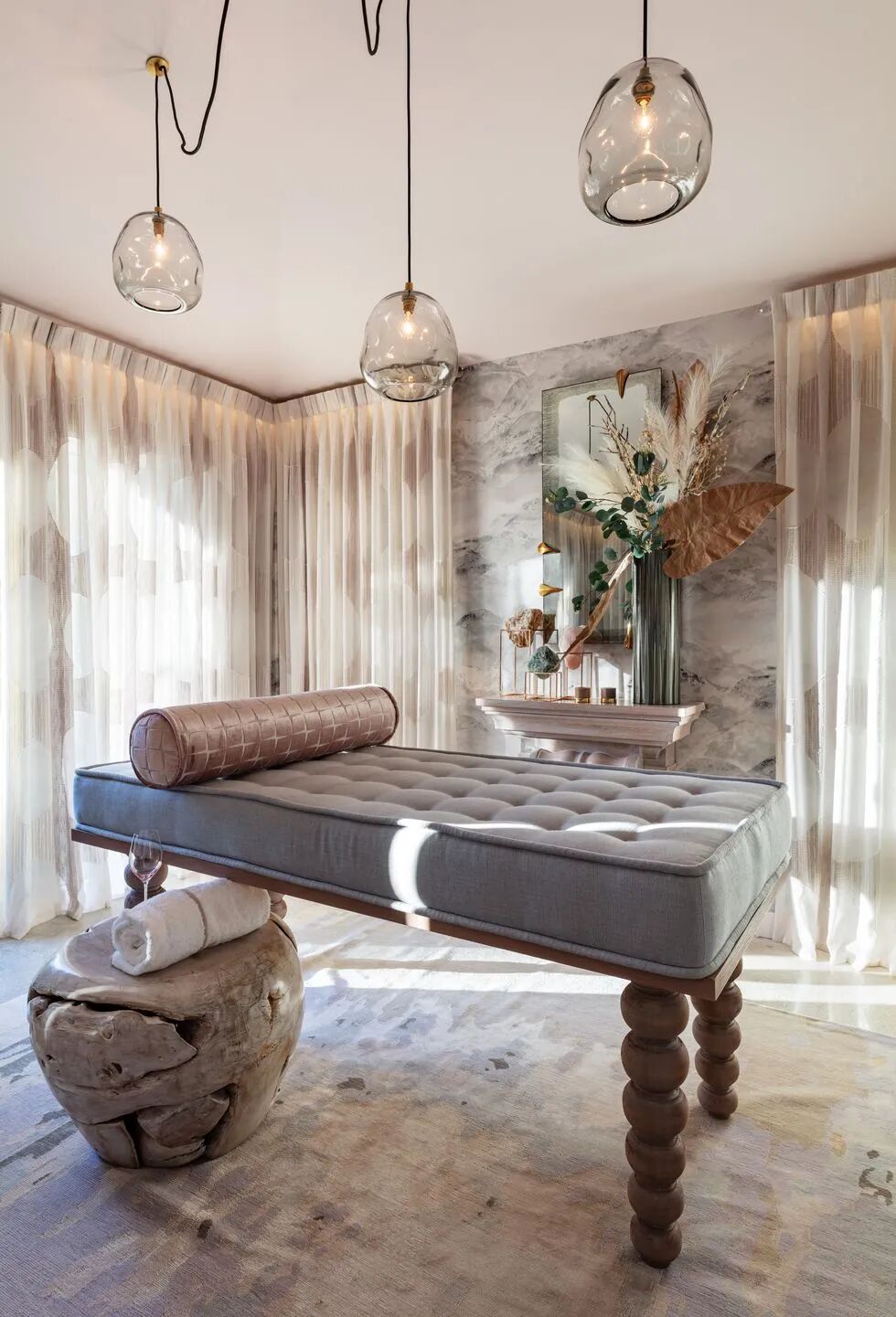 倒角褶皱,轨道固定式窗帘包裹的角落将这个水疗空间包裹在柔软舒适的环境中。设计师 Keith Baltimore 说,这种来自Zoffany的透明的亚麻布会柔和地调解自然光线,并“营造出一种禅宗般的绿洲感。