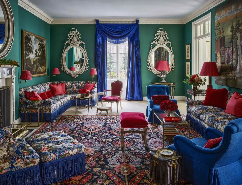 这些青金蓝色的塔夫绸窗帘被手风琴百褶的荷叶边包裹着,呼应着沙发的流苏镶边,十分优雅,是对传奇人物John Fowler的致敬。
