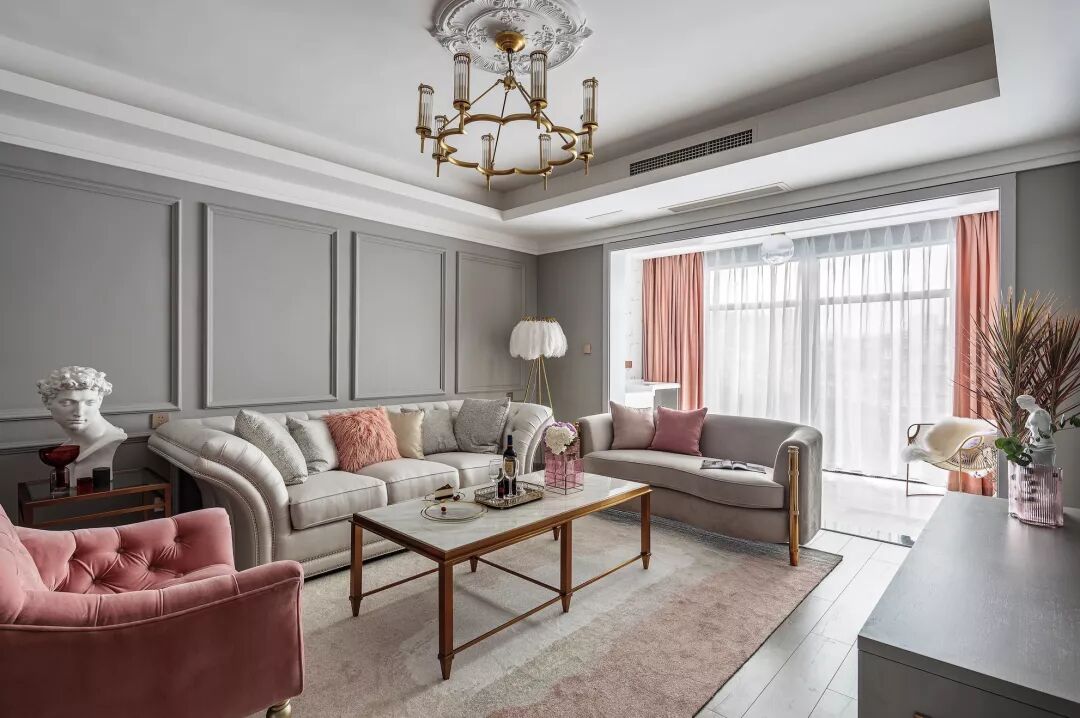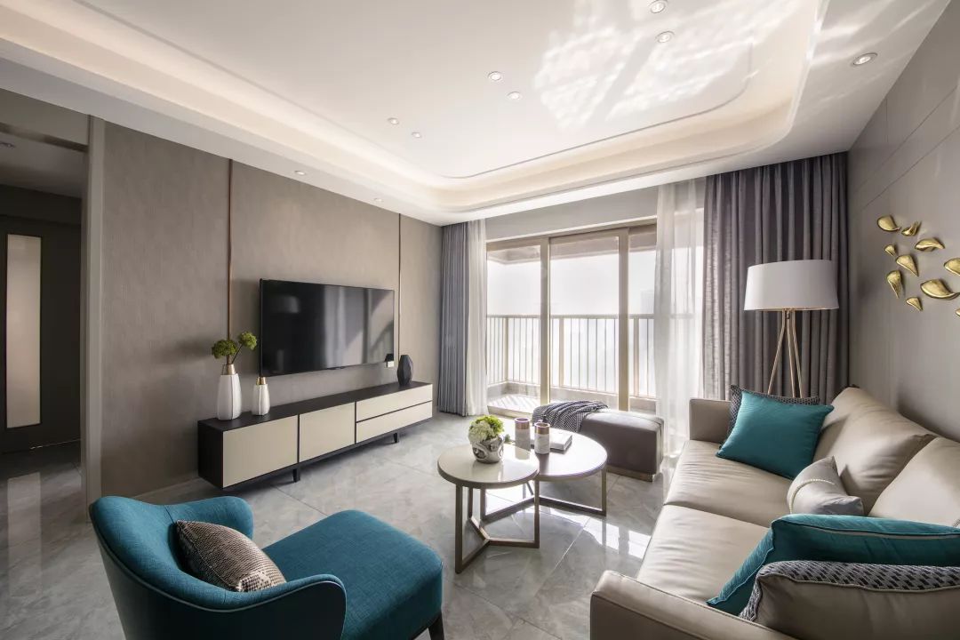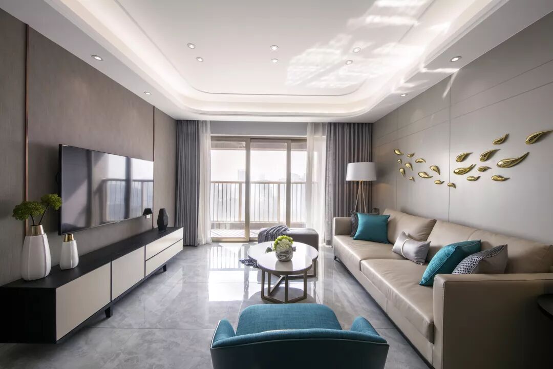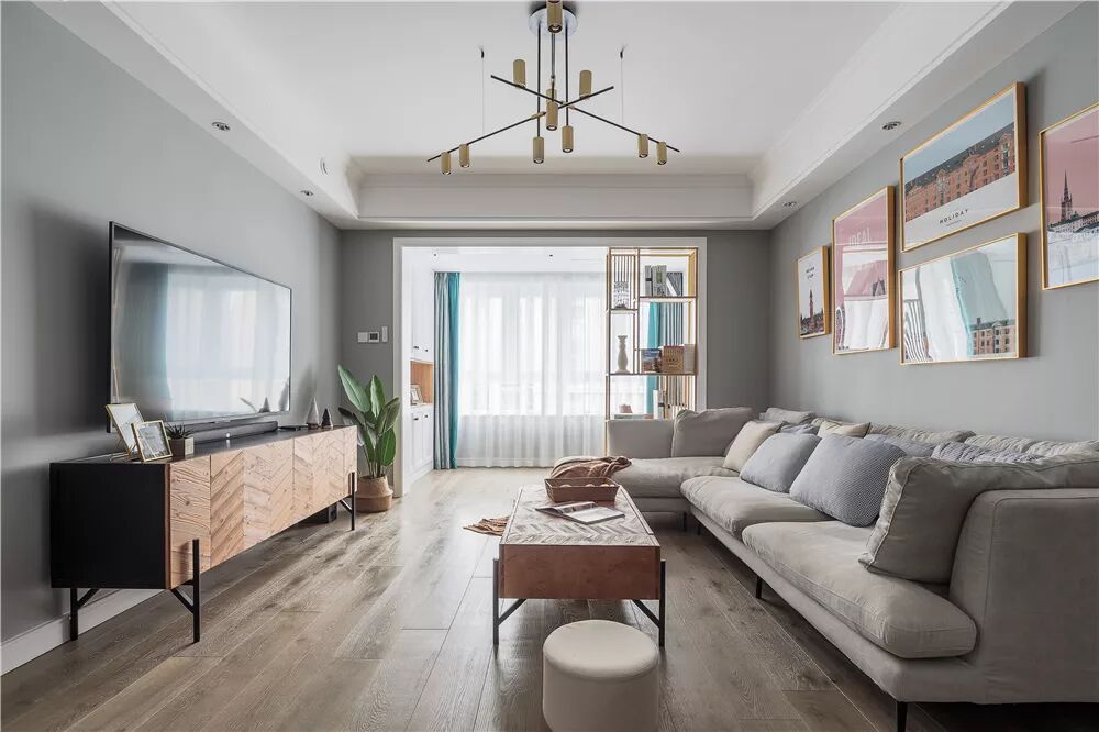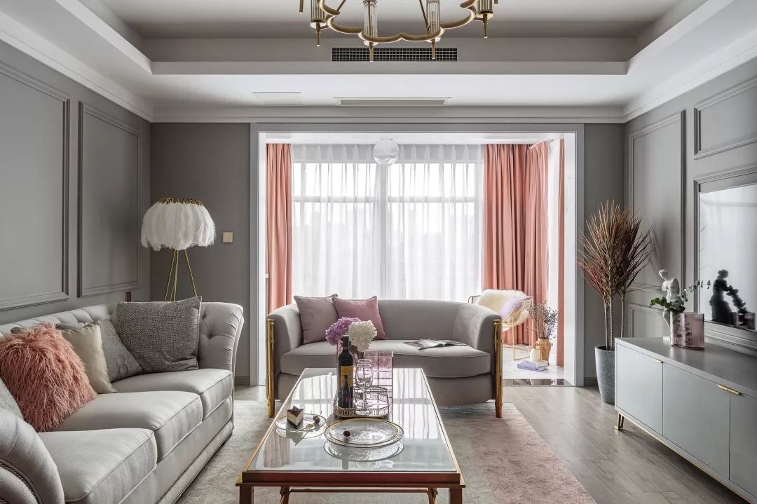 整体客厅以现代轻奢风为基调,大面积采用灰色,窗帘也是灰色的,完全融合于整个空间。低调内敛的灰色呈现出一个舒适优雅的华丽空间感。