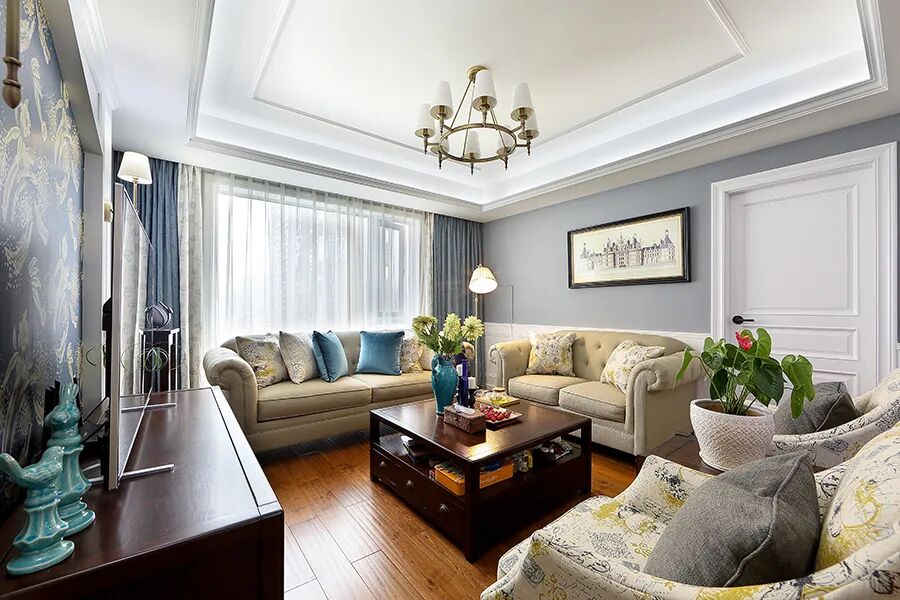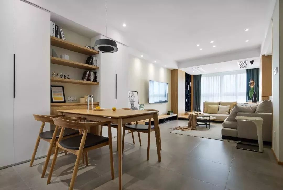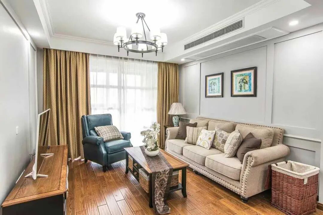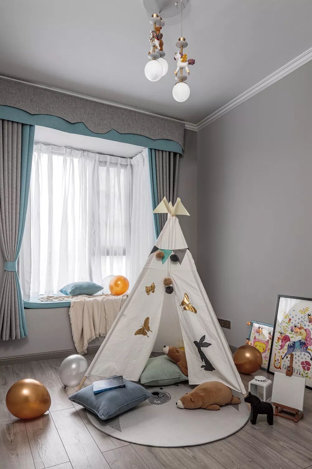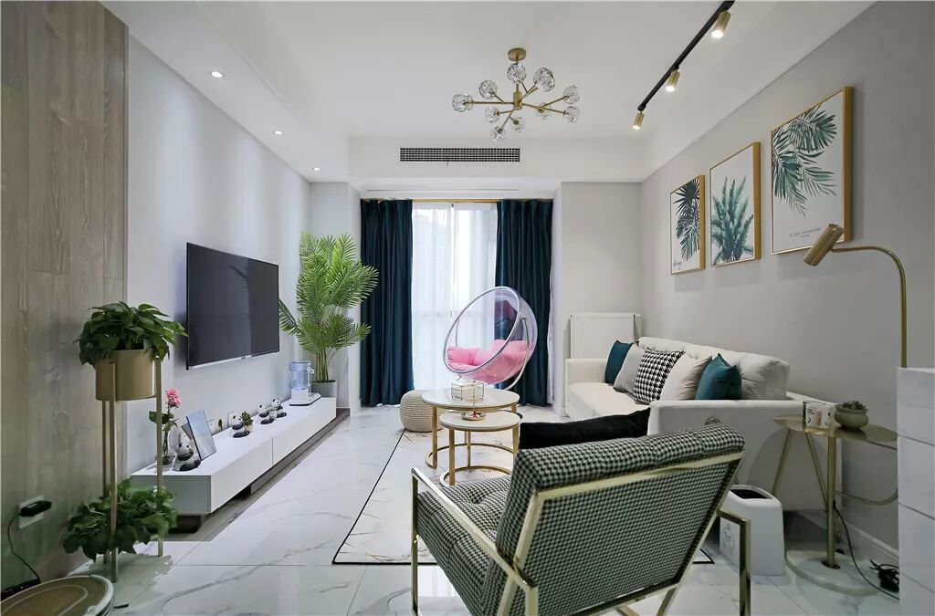 整体客厅以现代轻奢风为基调,大面积采用灰色,窗帘也是灰色的,完全融合于整个空间。低调内敛的灰色呈现出一个舒适优雅的华丽空间感。