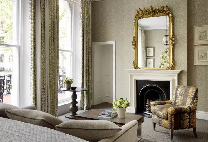 卧室的搭配比客厅里更加缤纷,先是图案花式的运用,简单而随性,没有过多的条条框框使得图案叠加在一个良好的感觉范围内。再者金色边框镜面增添了贵气成分,无形之中增加了视觉影响力,会让整个空间的设计感提升一层。
