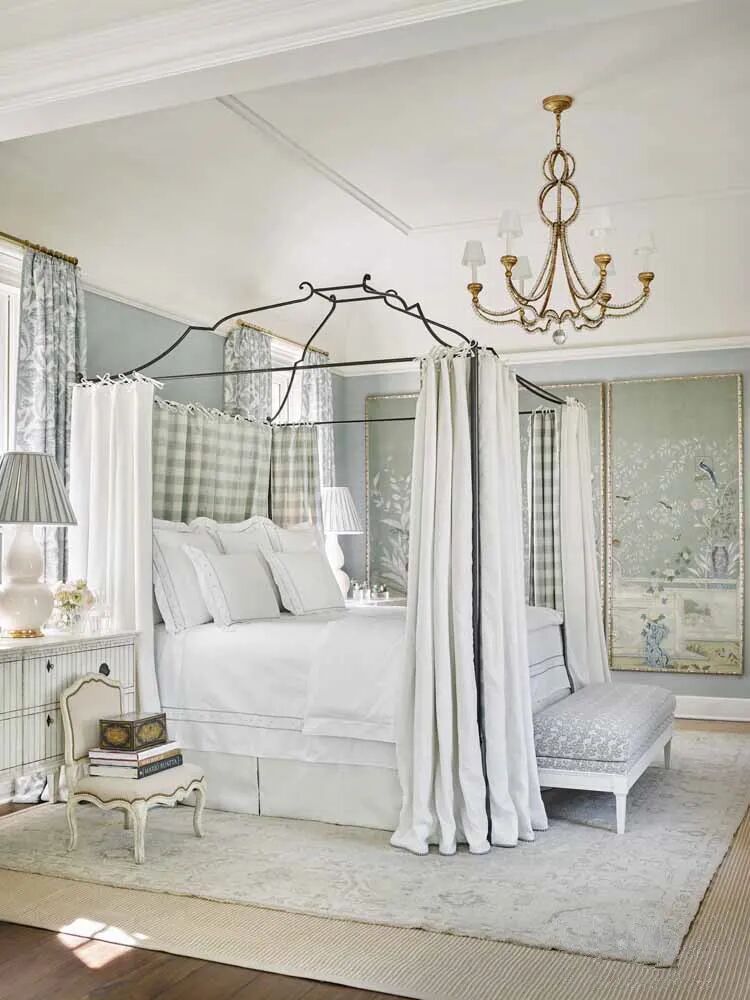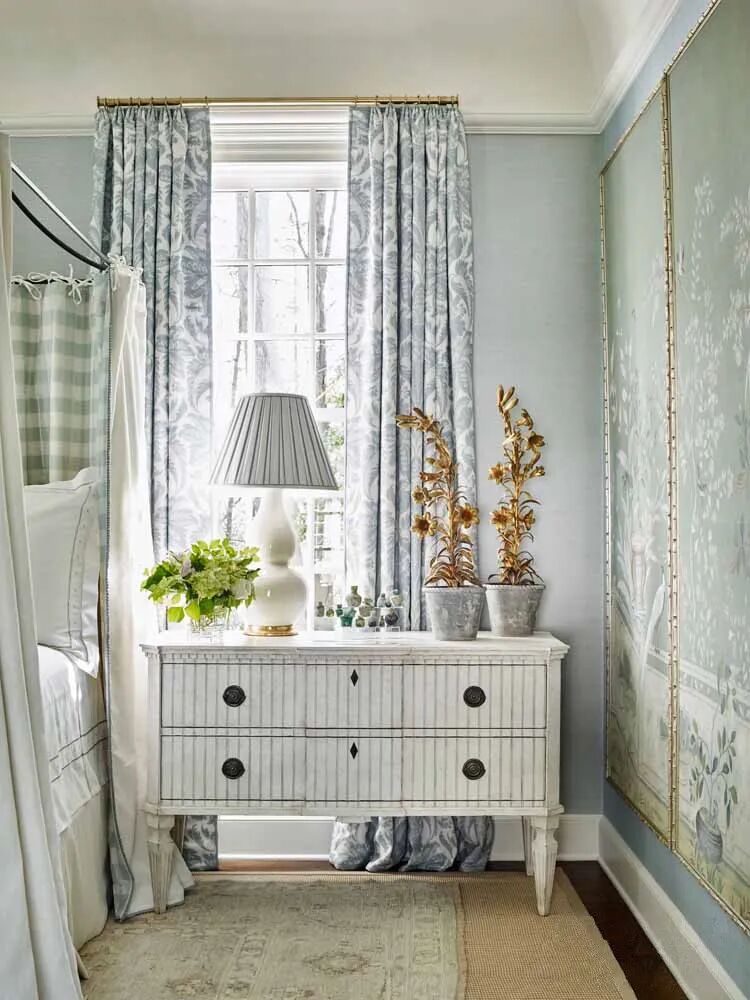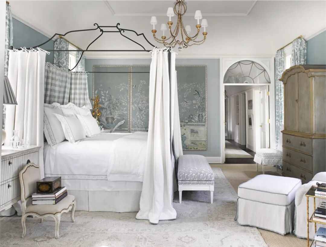 这间宁静的主卧室是一个可以逃避尘世烟火的避难所,这主要归功于浅淡的蓝色调和层层叠叠的帘幕。印花、格子元素和中式花鸟画融合了雨云、水、石头的色调,在房间里巡游,创造出淡泊而美丽的感觉。层层窗帘不仅很好地照顾了隐私,还控制了光线,扩大了居住者对空间的体验。