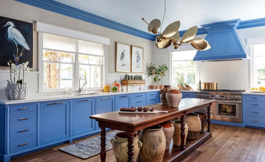 即使是最简单的窗户,看起来也都带有亚麻装饰的檐口,并配有黄铜钉头饰边。这间厨房的设计师表示:“我们想让尽可能多的光线进入房间,并且檐口在不遮挡光线的情况下完成窗户的装饰。”