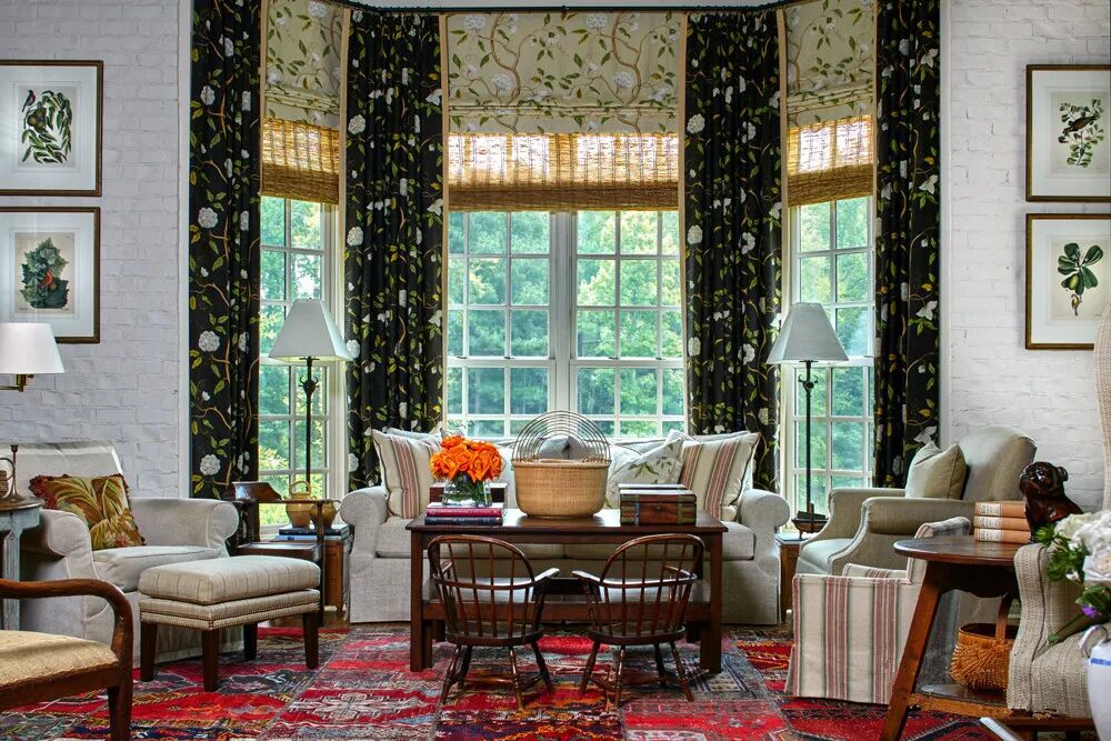这间精致的起居室拥有经典的美式风格内饰,所营造的柔软和温馨令人赞叹。深色的垂直印花窗帘和浅色的罗马帘在编织的遮阳帘上分层,并拥有温暖的饰边,白色砖墙强化了这种精致和现代的感觉,反映了一种奇特的浪漫和冒险经历。