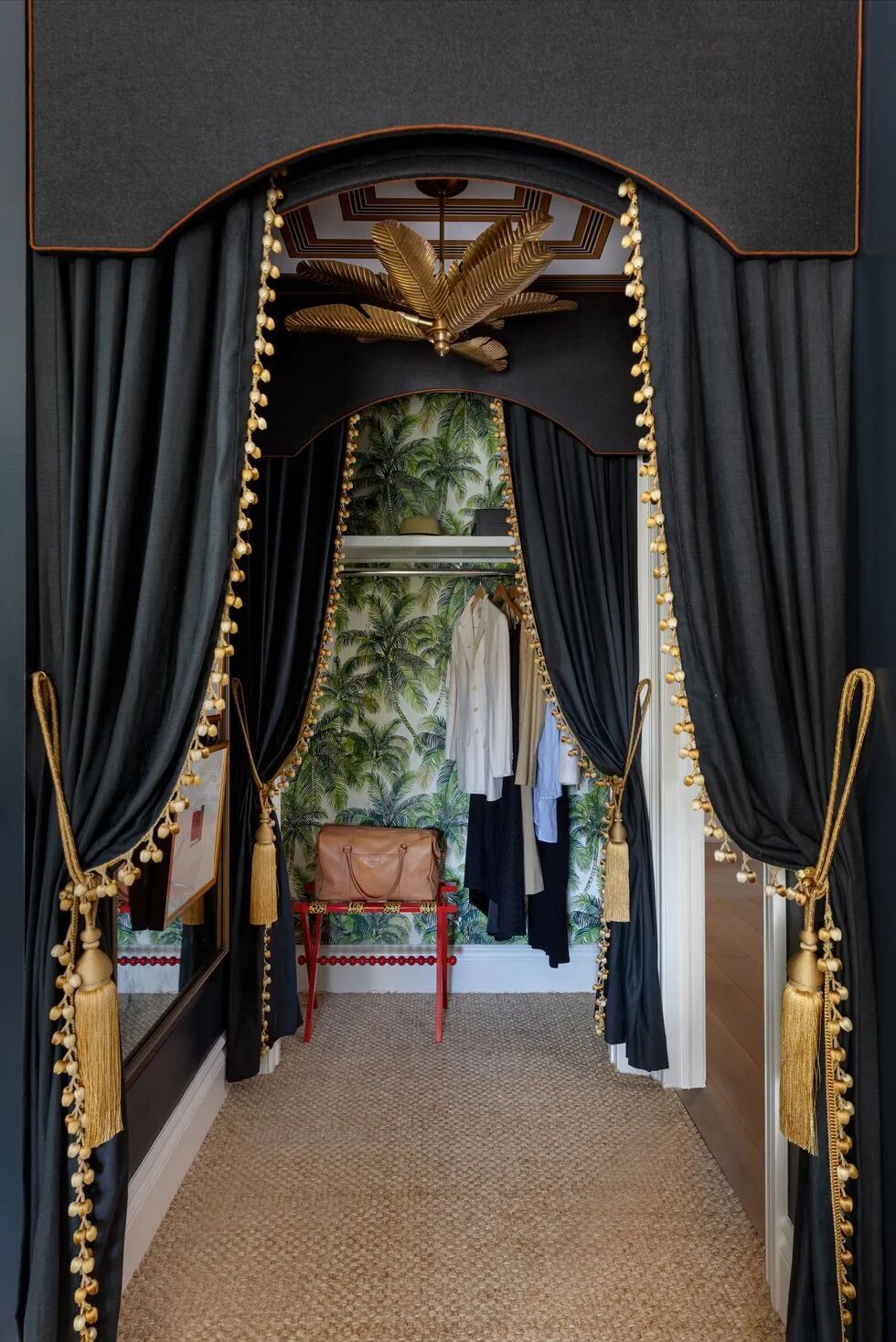 为了创造一个更引人注目的入口,设计师用炭色亚麻布帘和包边的檐板取代了壁橱和卧室的门,从而使整个空间流通起来。垂坠的金色流苏点缀着层层布帘,打造出一种复古的奢侈感。